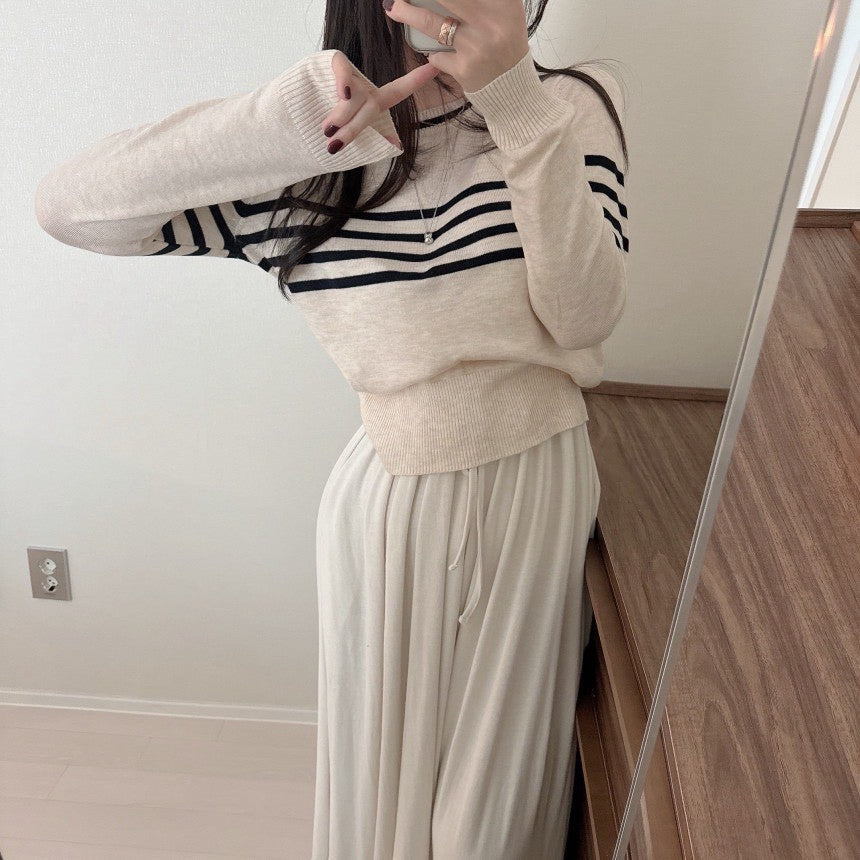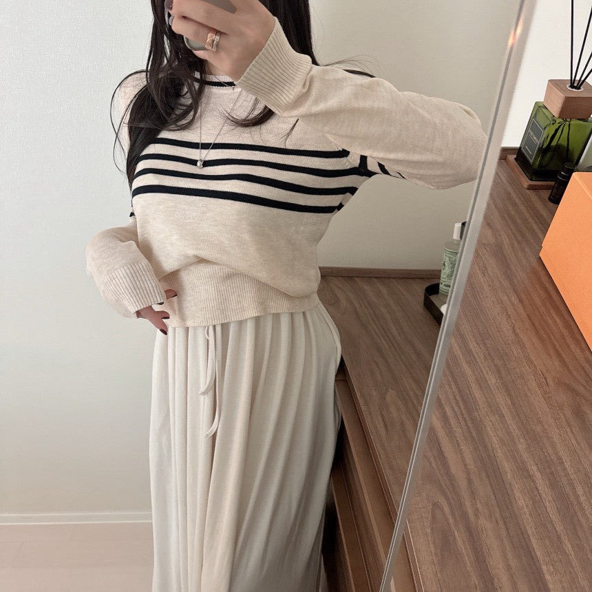 Mon. 簡約撞色線條圓領針織上衣 杏/藍
