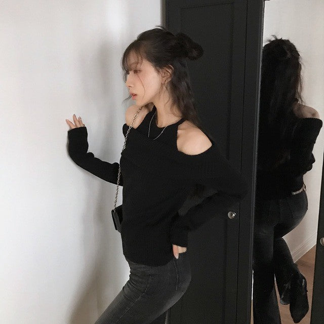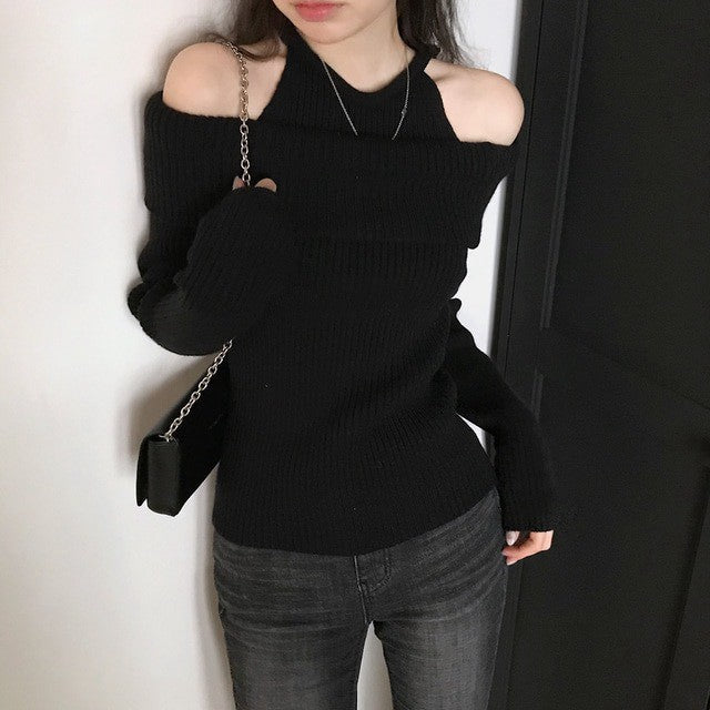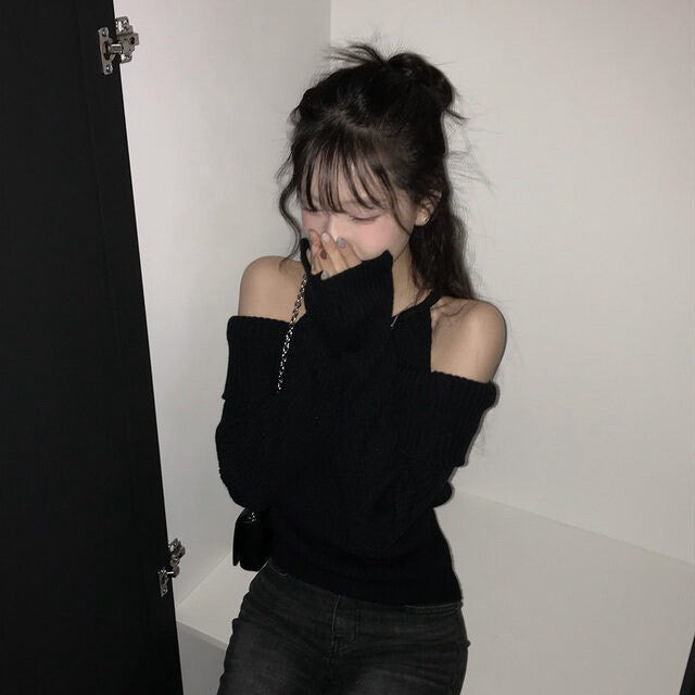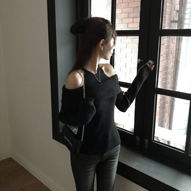Mon. 純慾滿分 假兩件式露肩修身針織上衣 黑