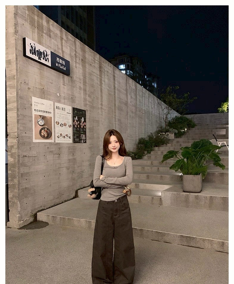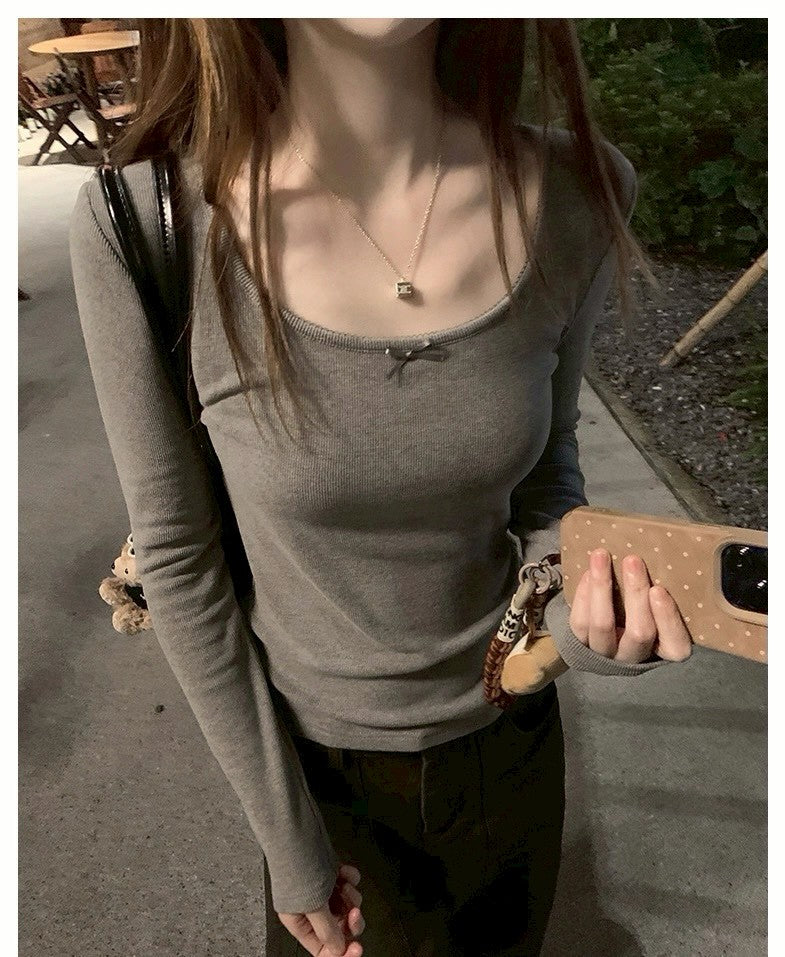 Mon. 軟呼蝴蝶結U領磨毛打底上衣 白/灰