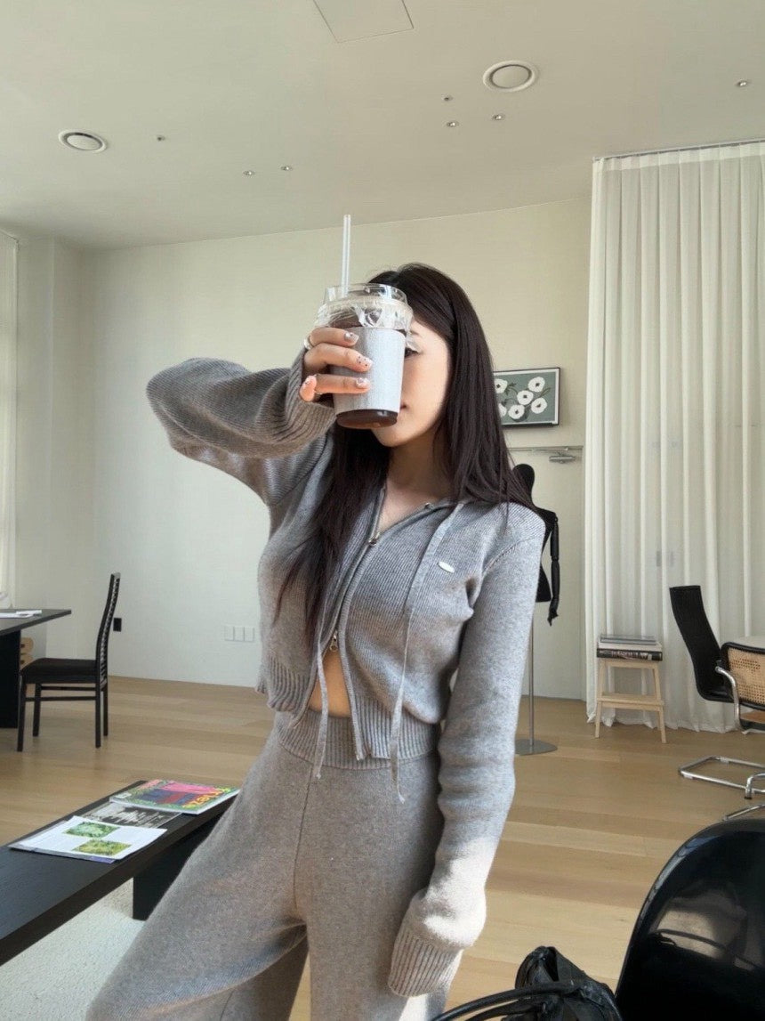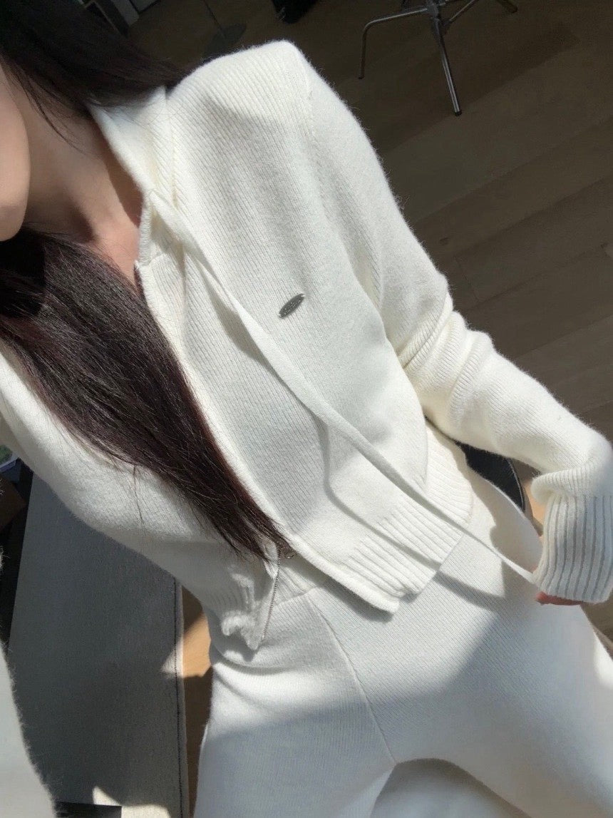 Mon. 運動休閒雙拉鏈連帽針織休閒褲套裝 米/灰