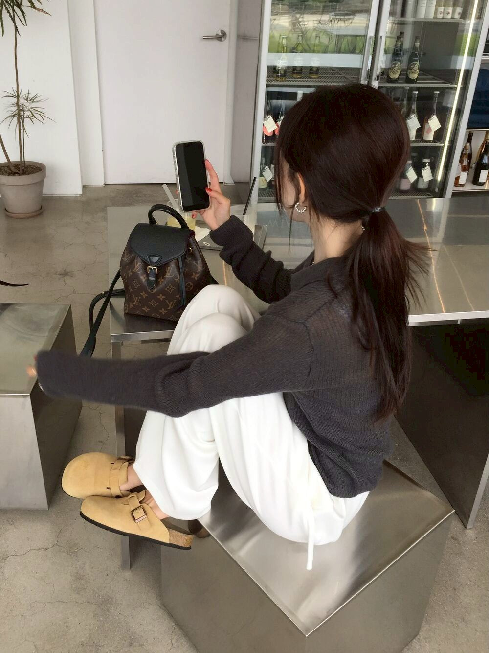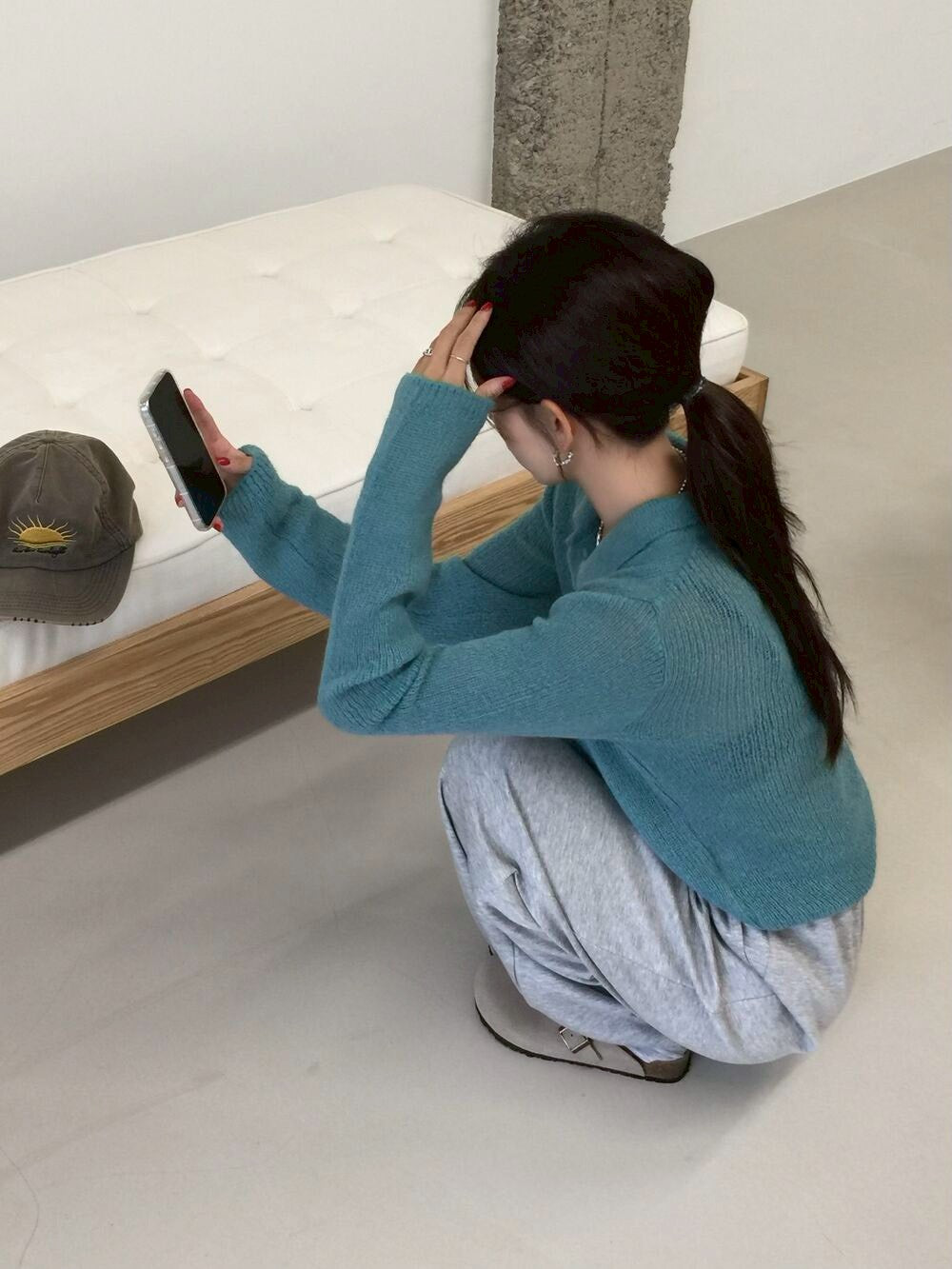 Mon. 韓女慵懶感特殊機法微透視針織襯衫 湖藍/灰