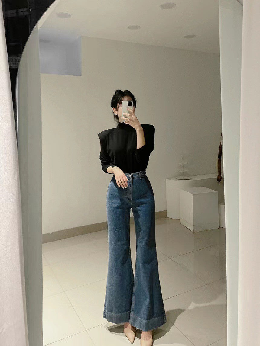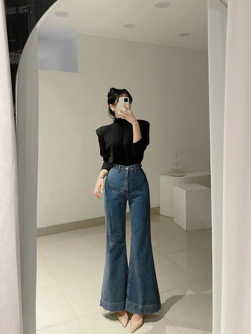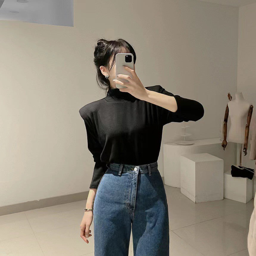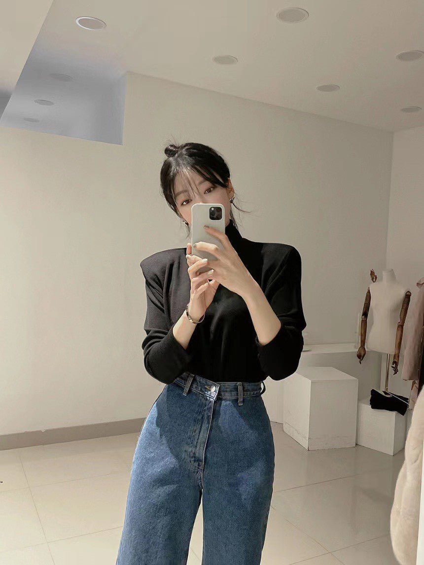 Mon. 韓chic百搭磨毛墊肩高領上衣 黑