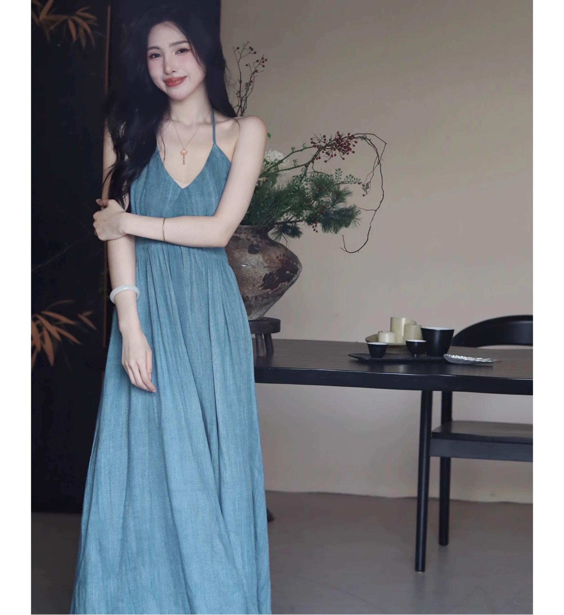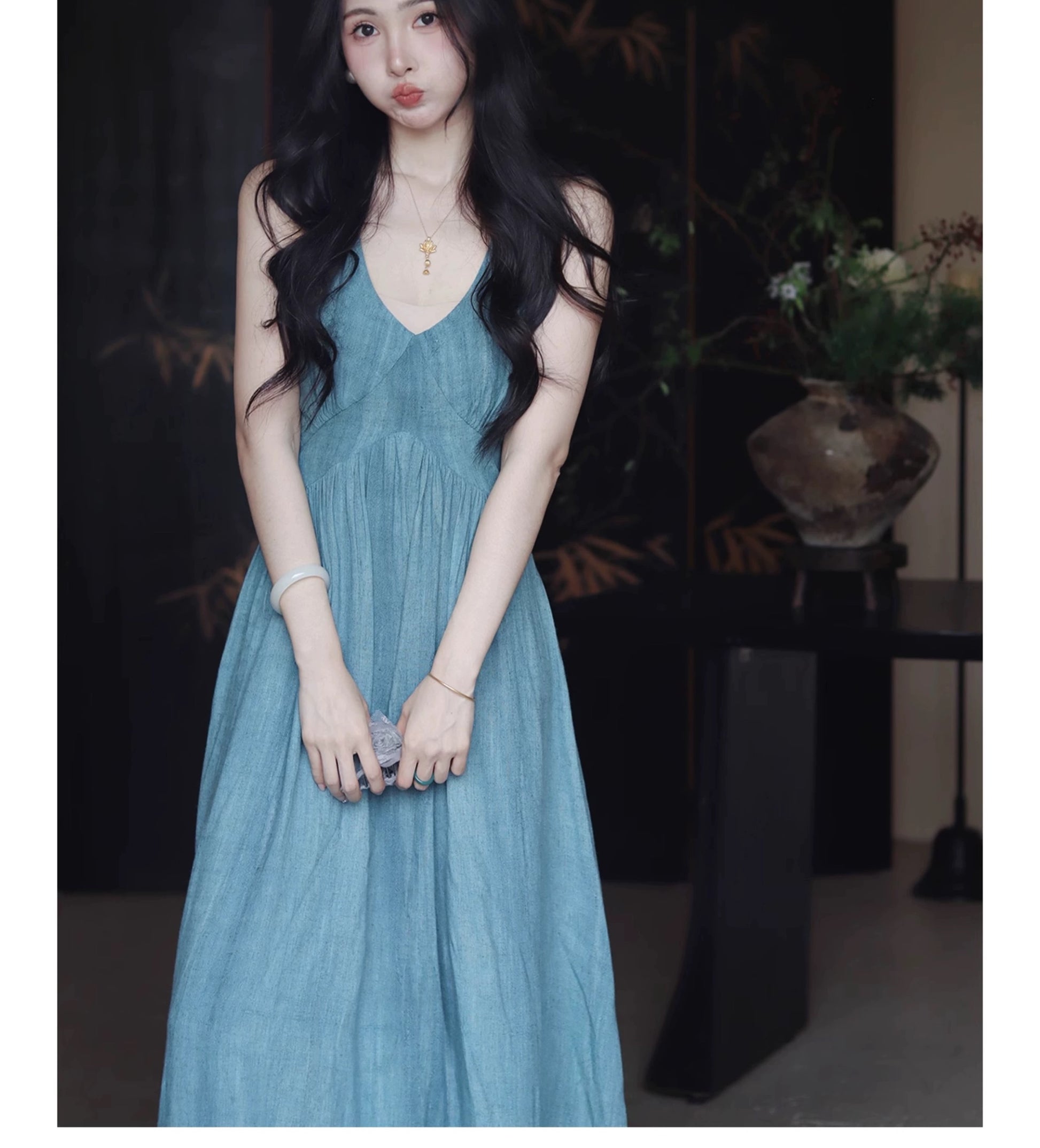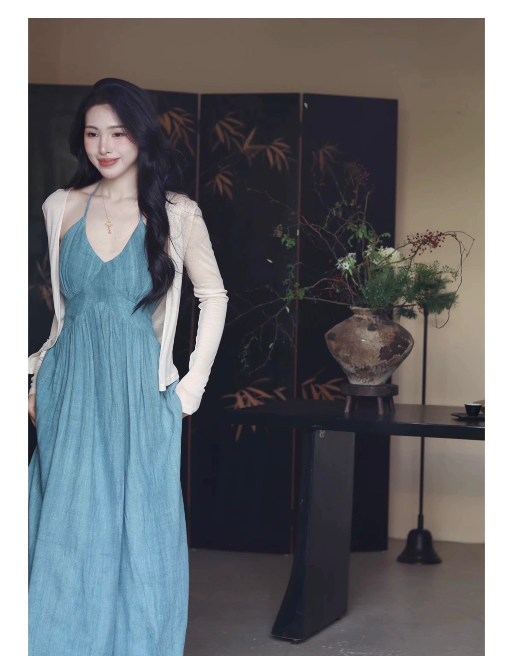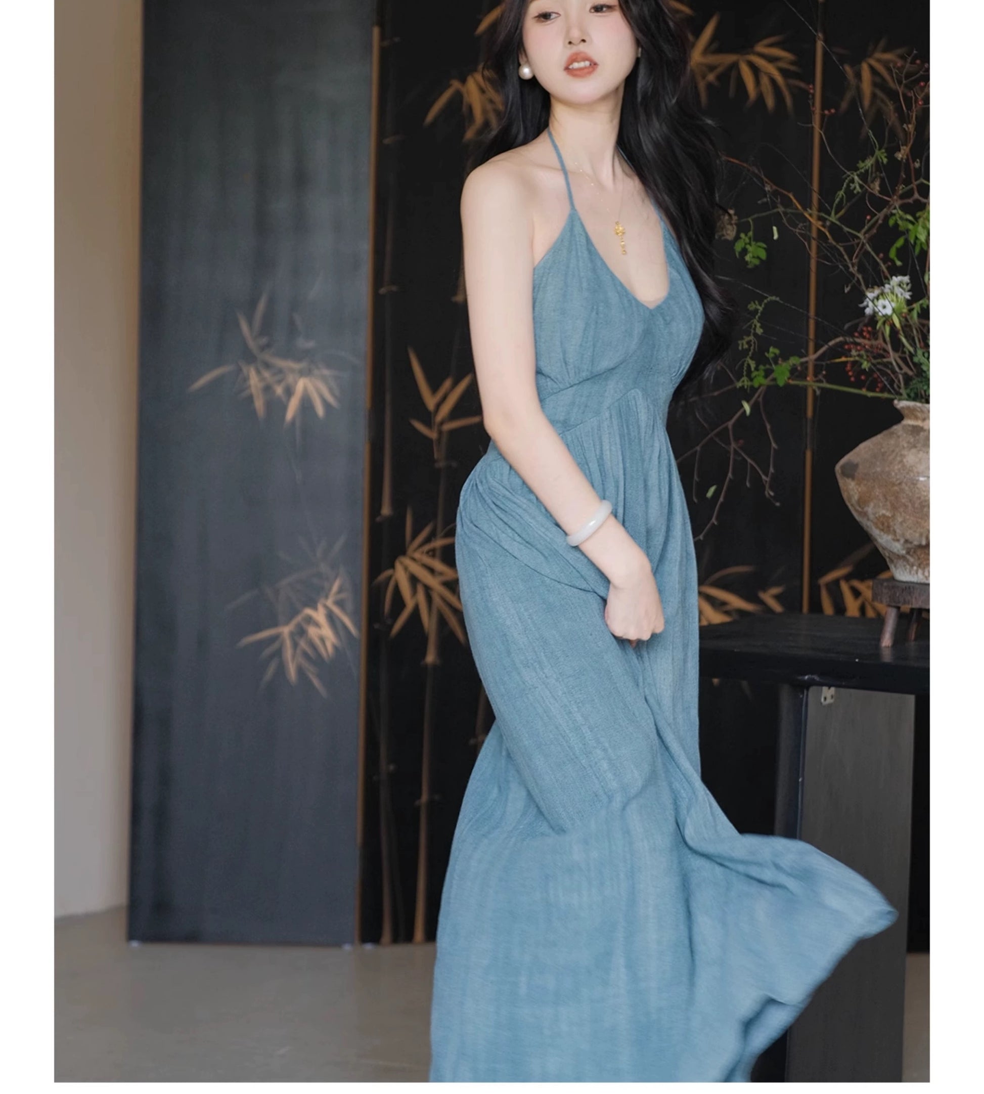 Sun. 天青雨國亞麻天絲法式收腰連身裙