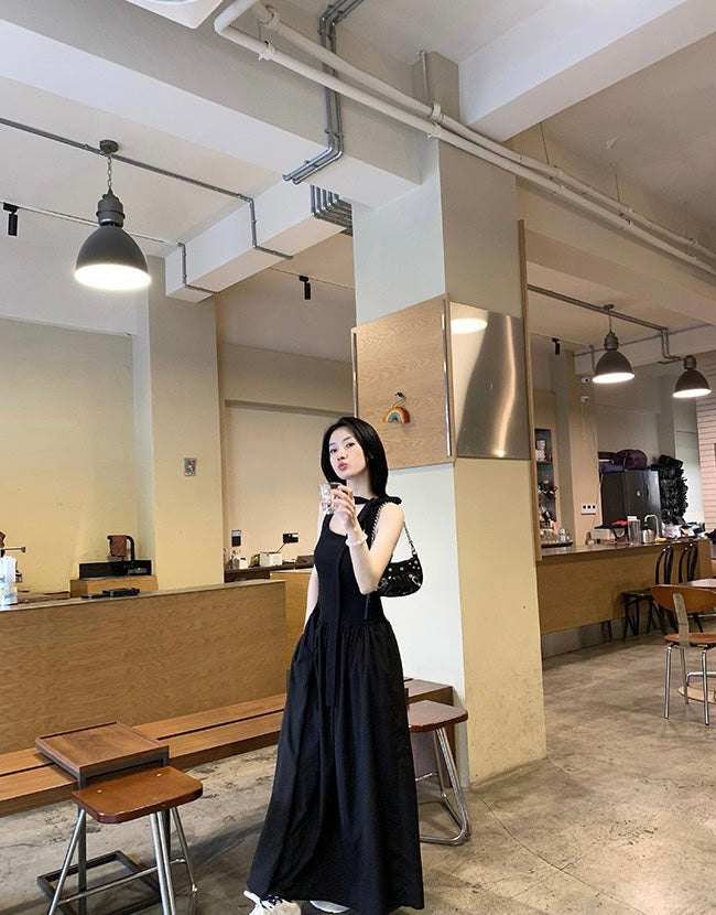 Sun. 氣質藝術家 方領飄帶掛脖收腰赫本連身裙 黑