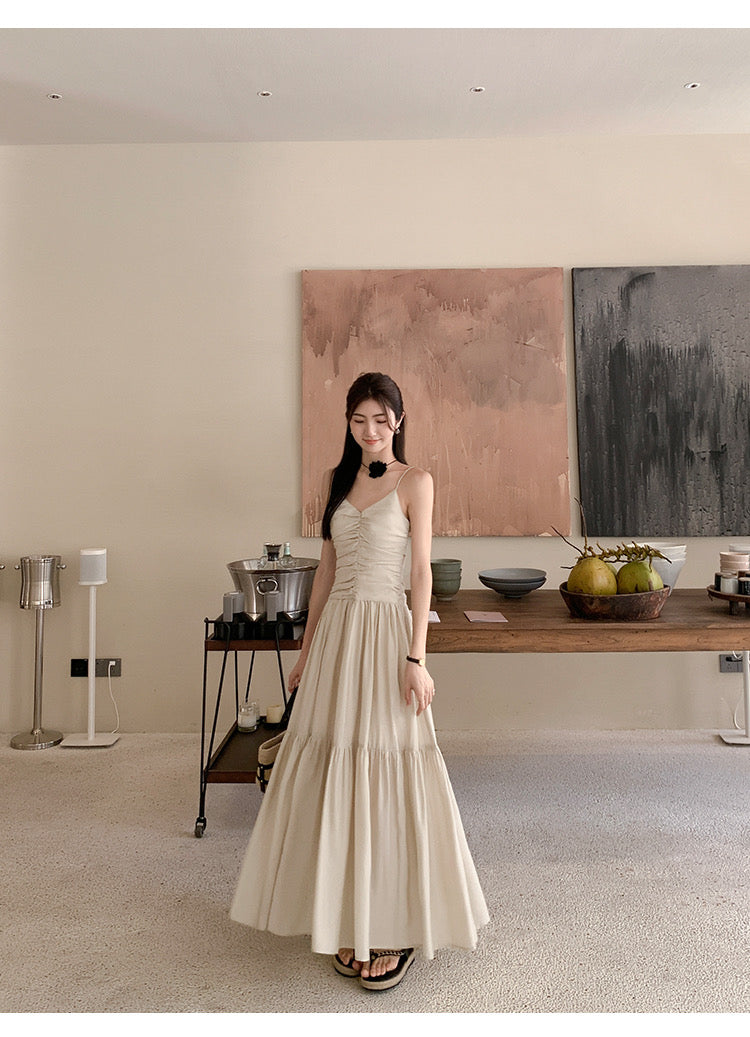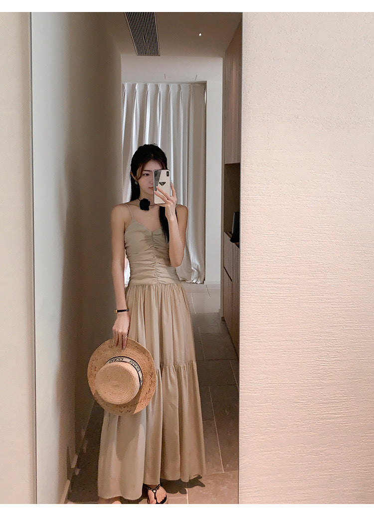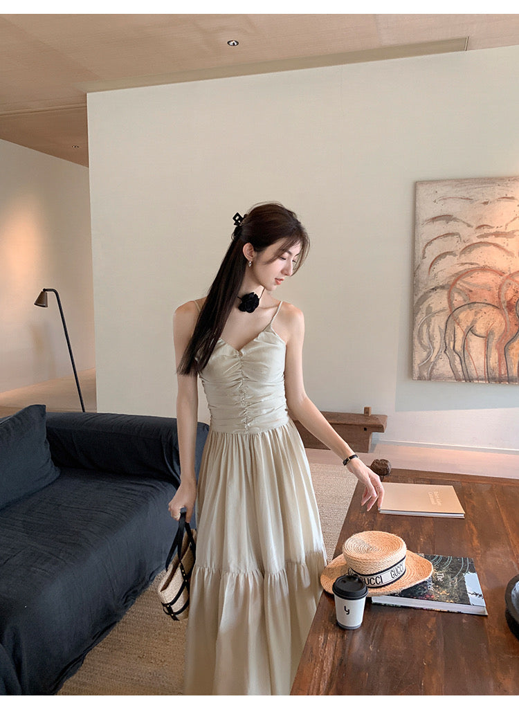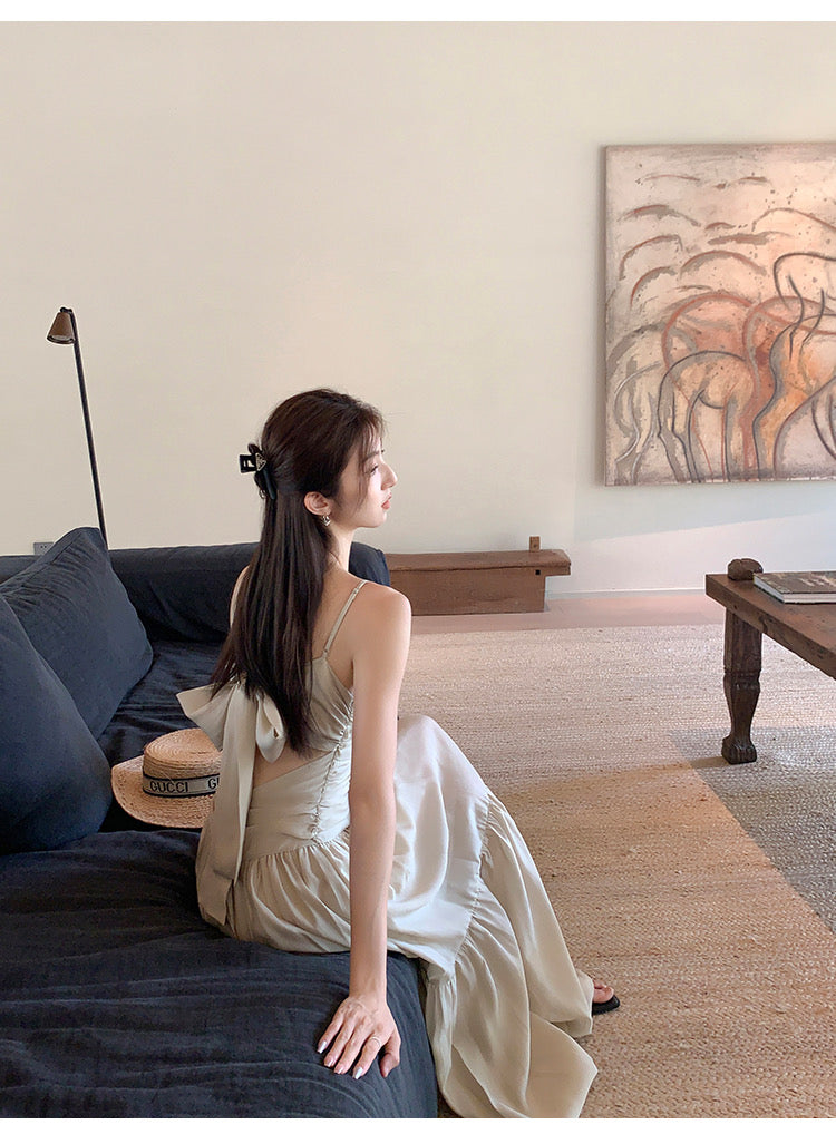 Sun. 美得像畫 氣質輕奢蝴蝶結綁帶v領連身裙 杏