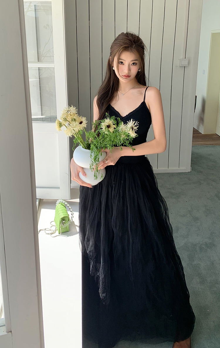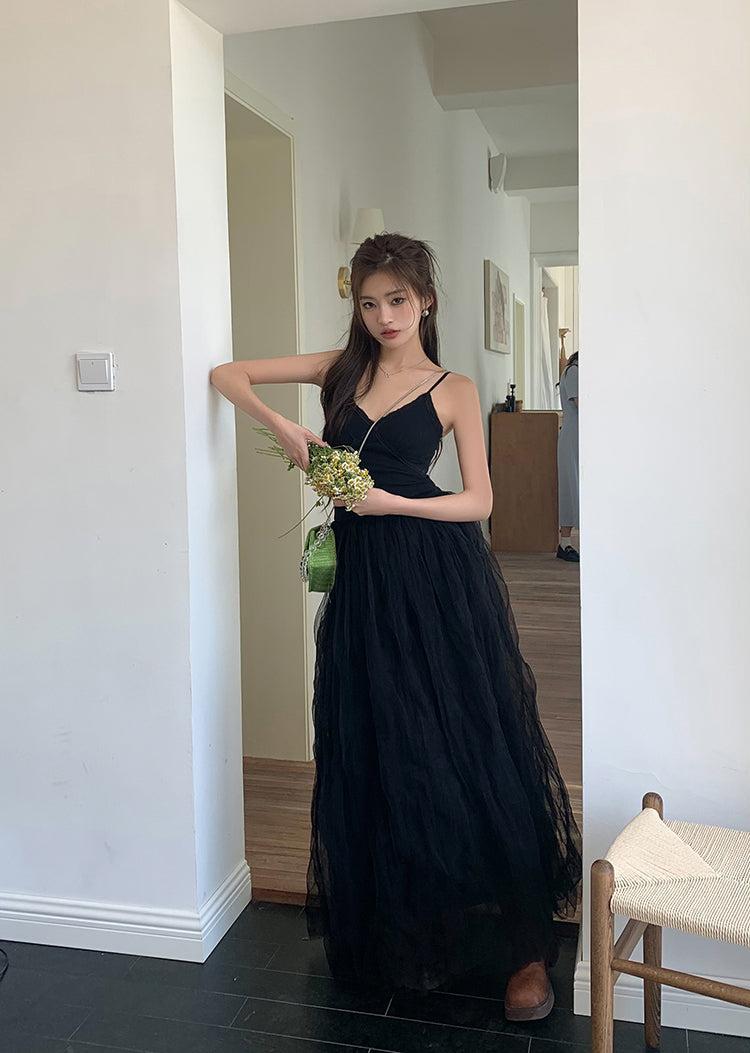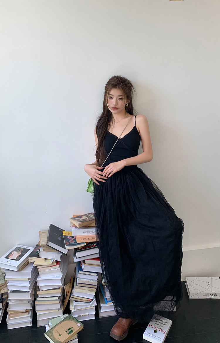Sun. 芭蕾網紗拼接連身裙 黑