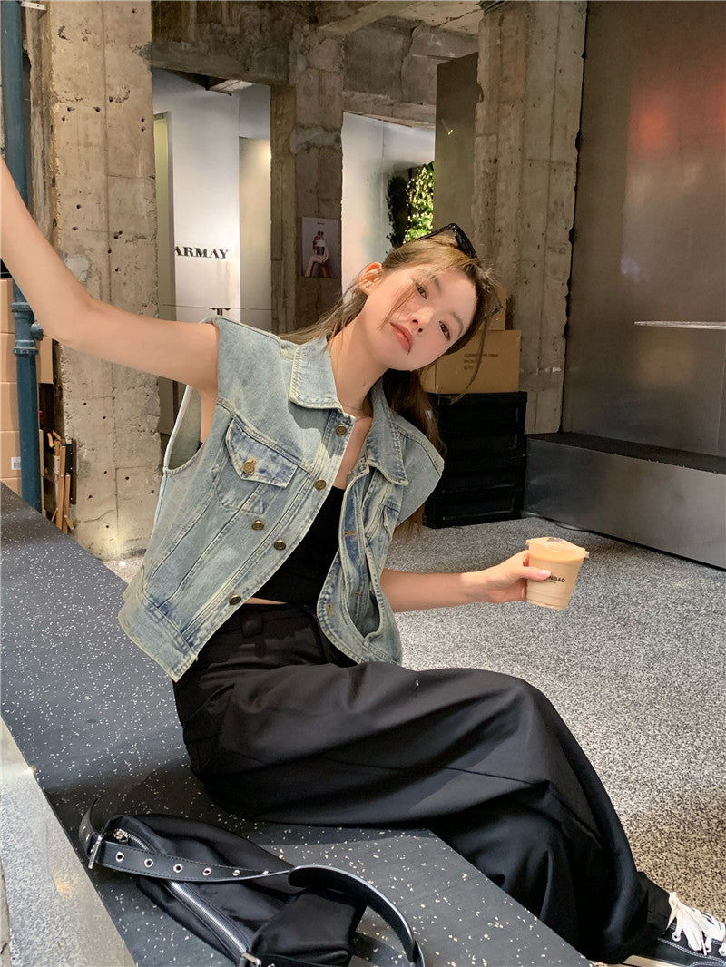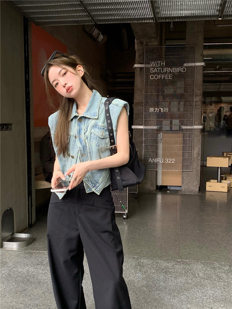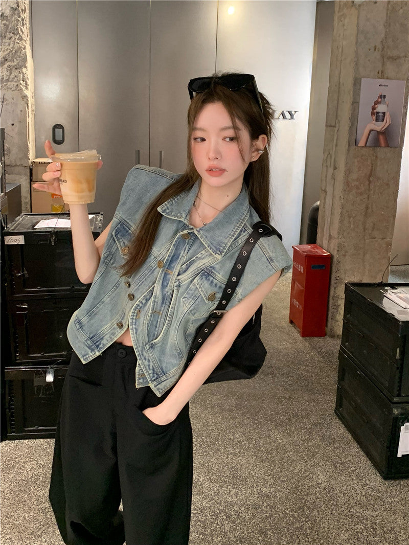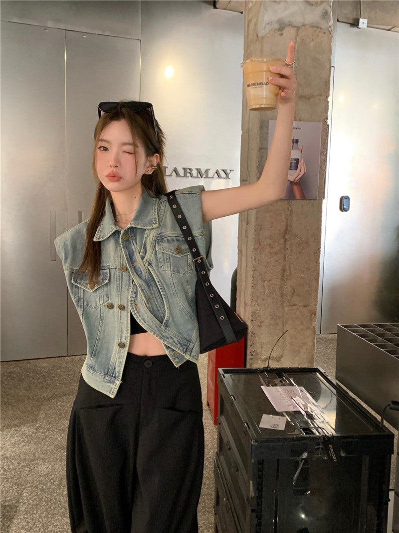 Thu. 不對稱單扣繞繩無袖牛仔外套