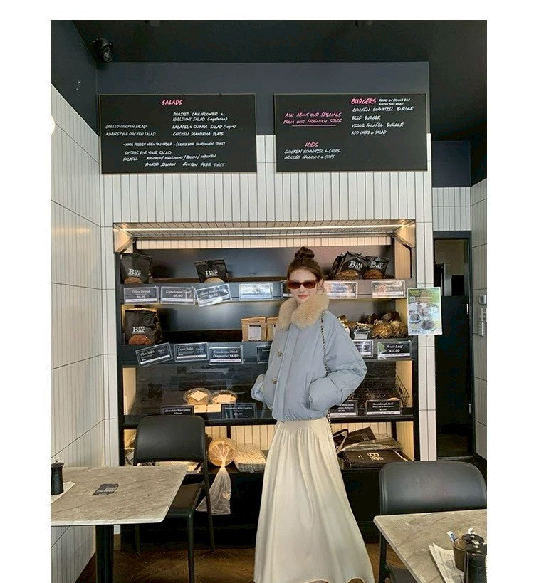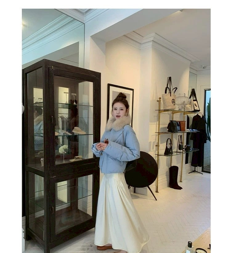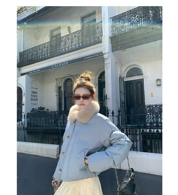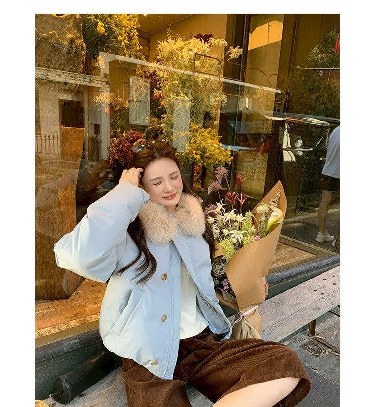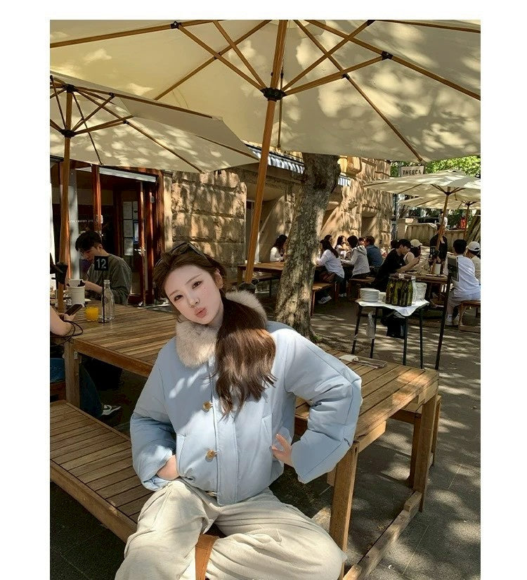 Thu. 卡斯托鎮仿狐狸毛領瘦瘦羽絨外套 藍