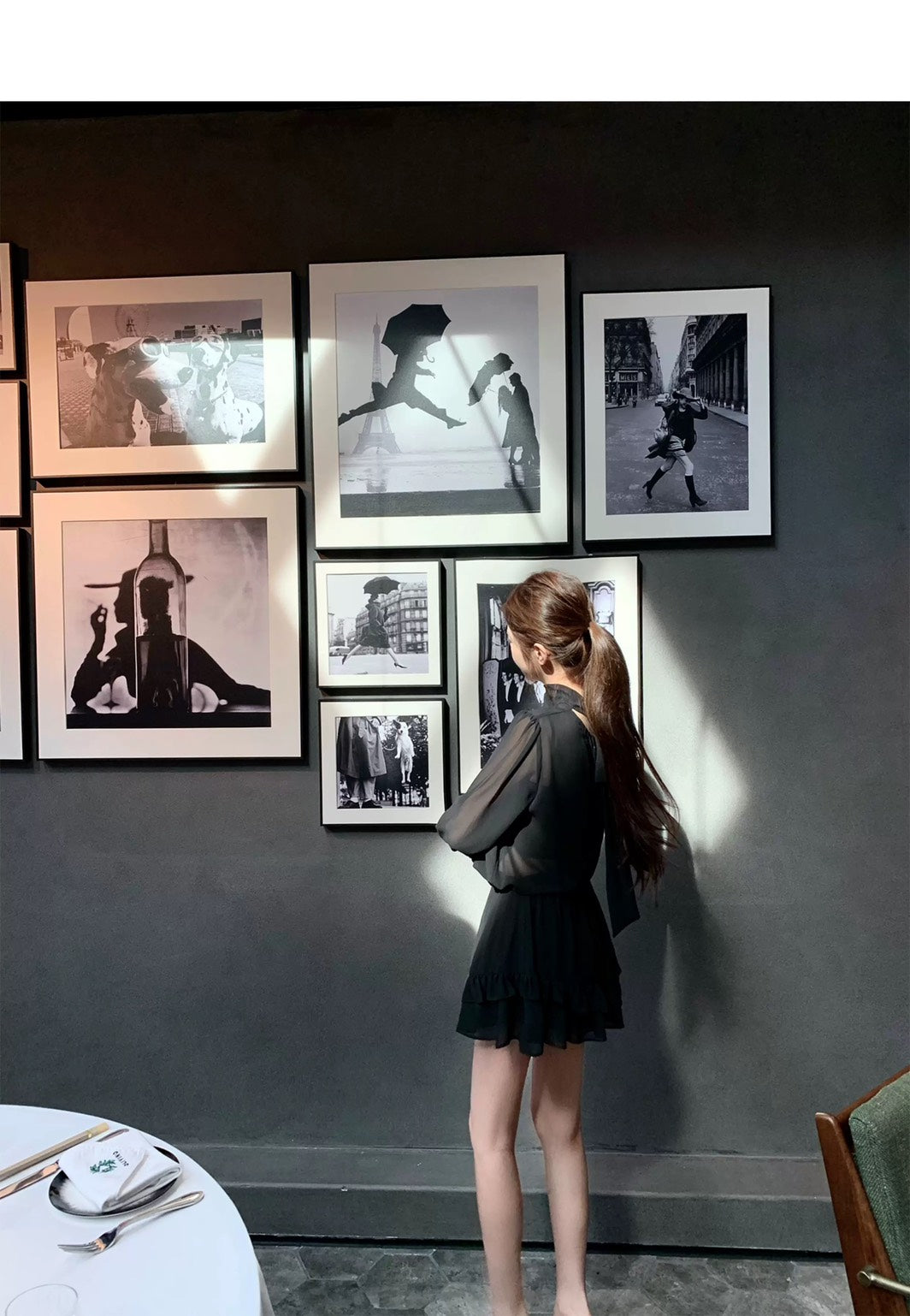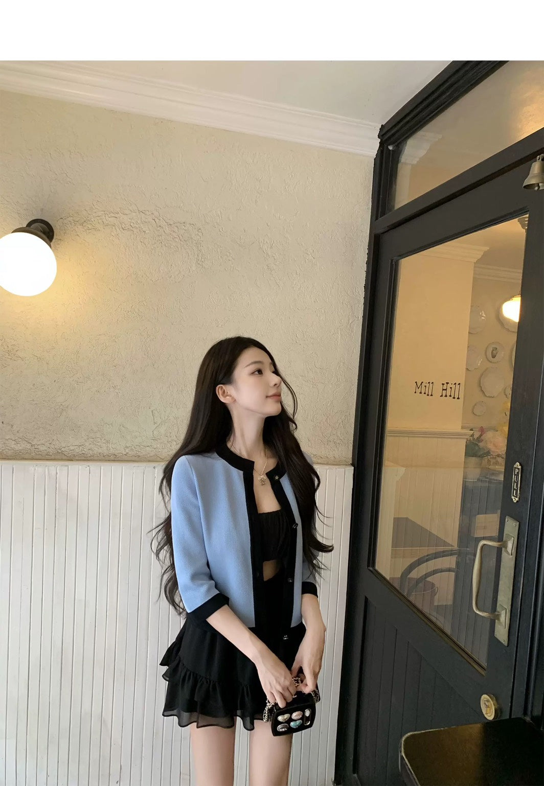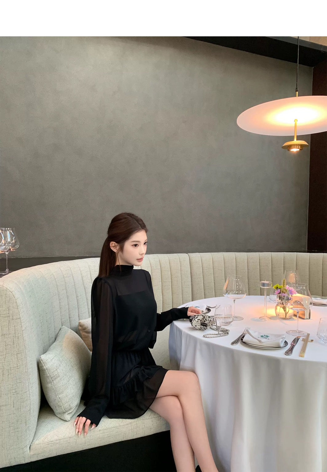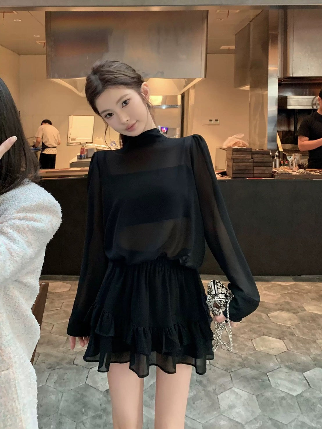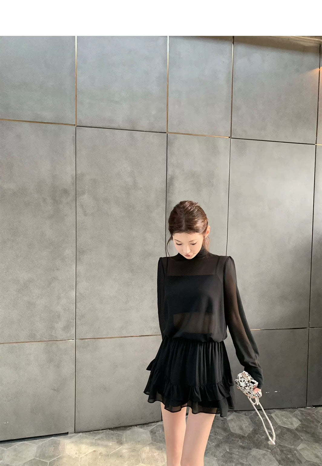Thu. 屋頂Y*L Rose風長袖雪紡上衣2件組 荷葉半身裙 黑