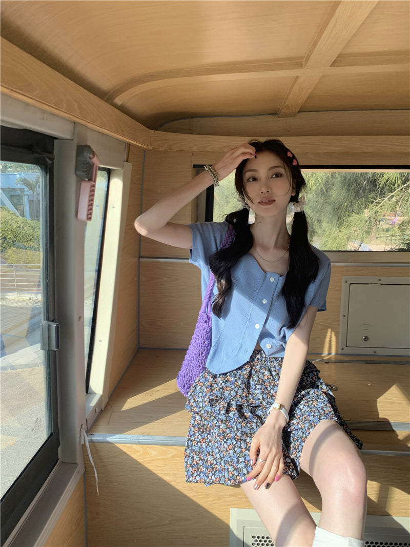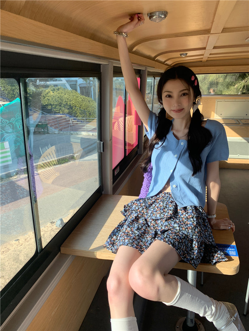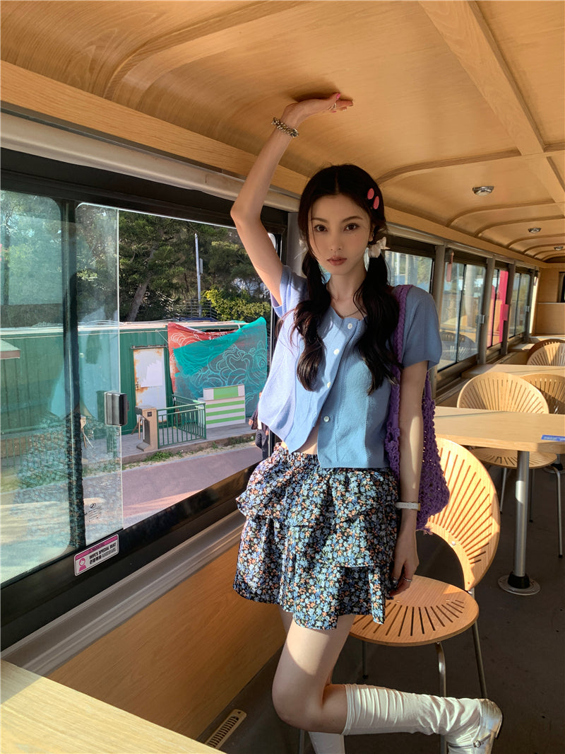 Thu. 方領針織鈕扣上衣 霧霾藍 蛋糕花裙