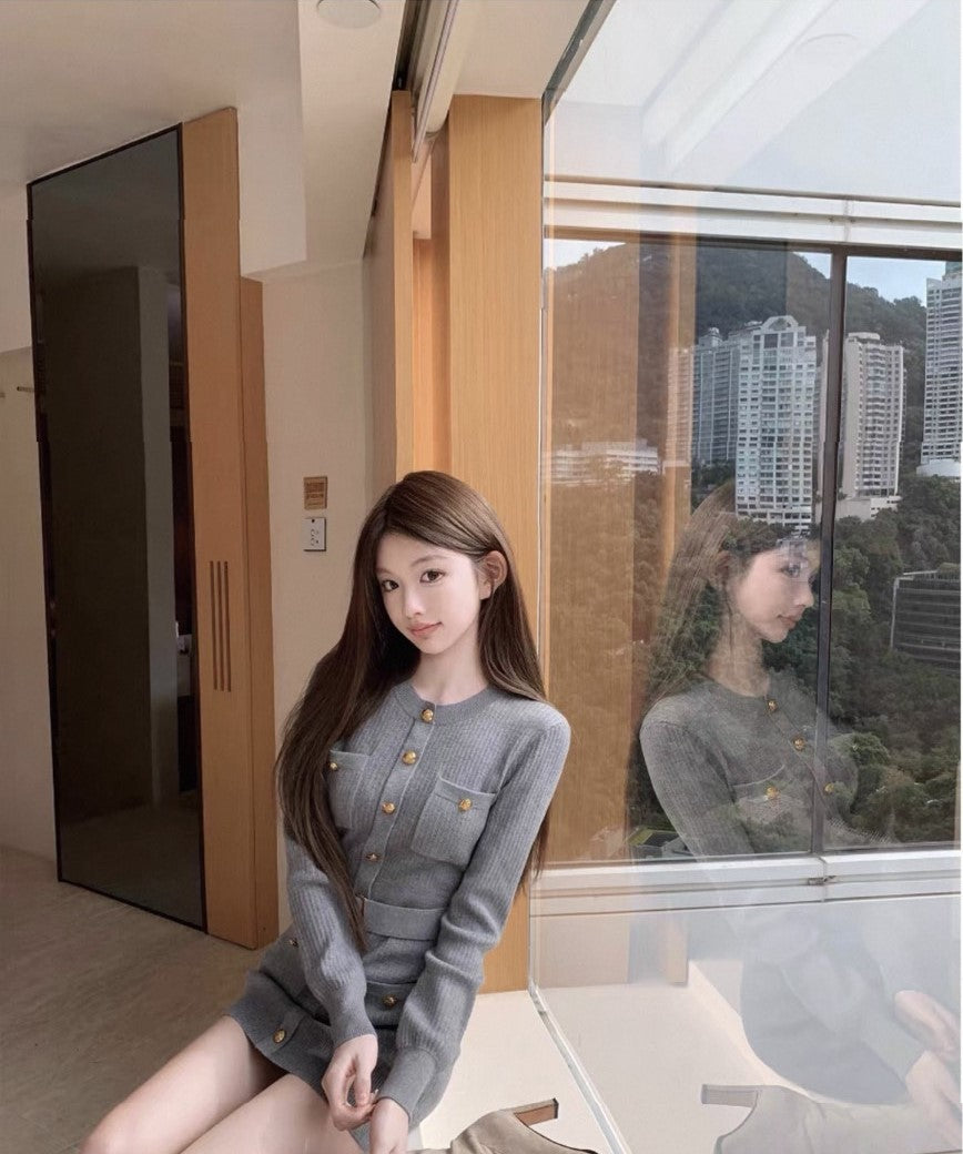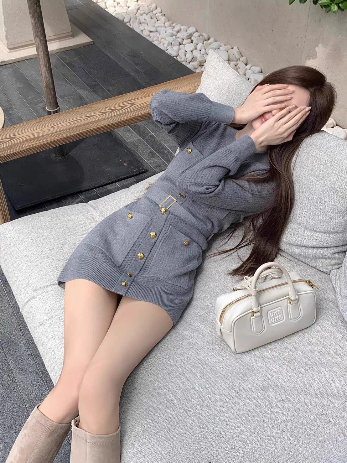 Thu. 江浙滬千金腰帶式金釦圓領針織連衣裙 灰