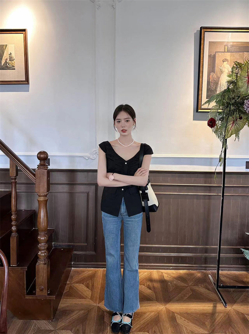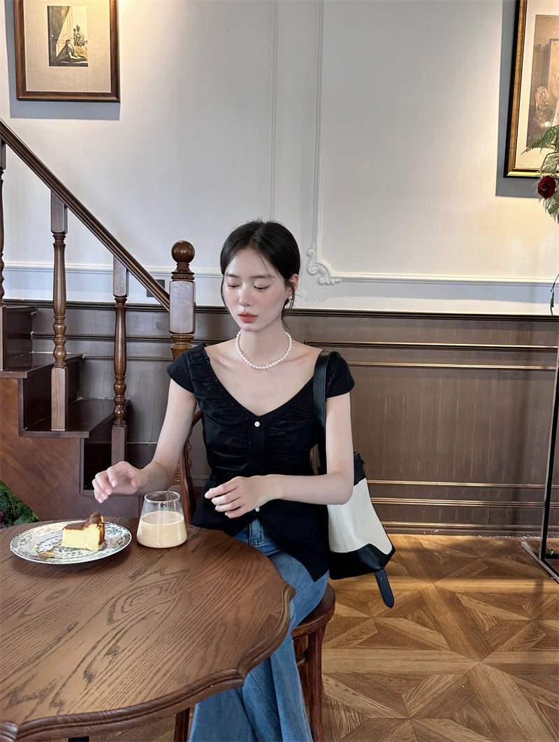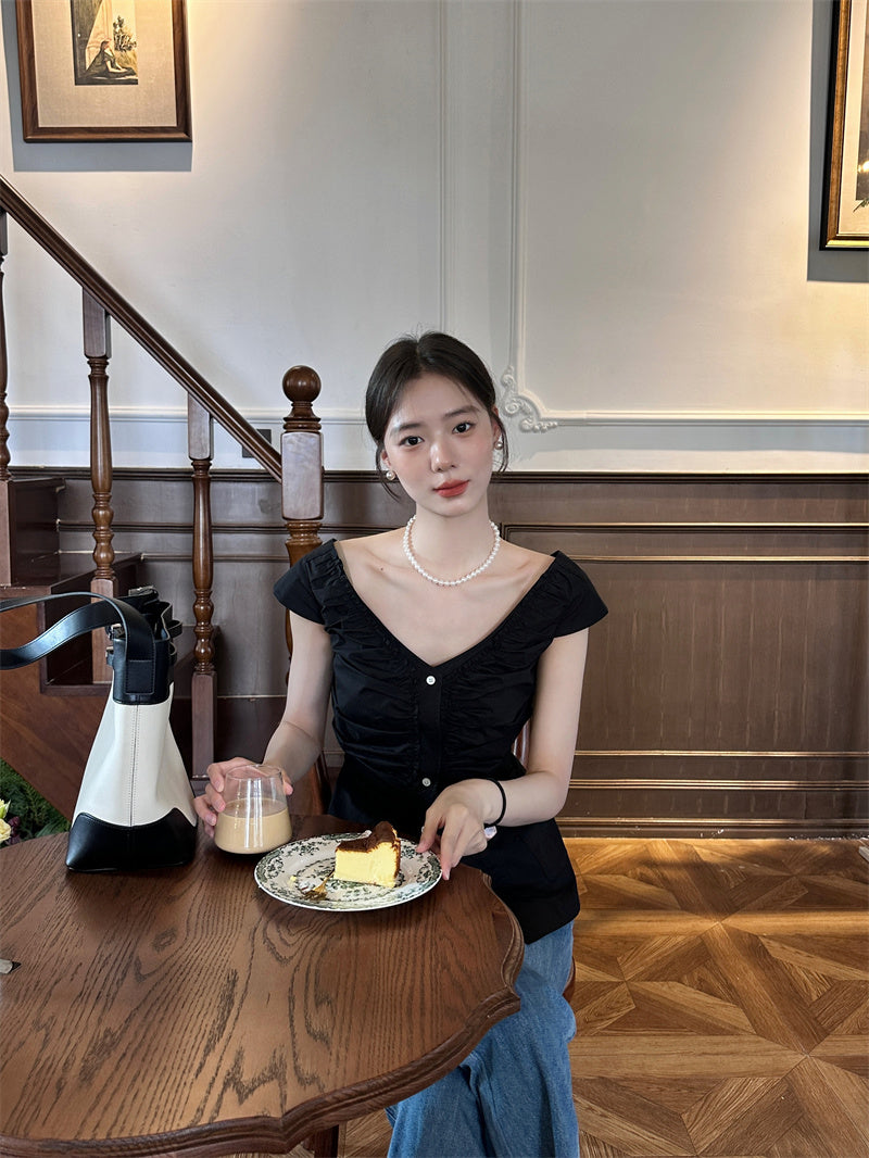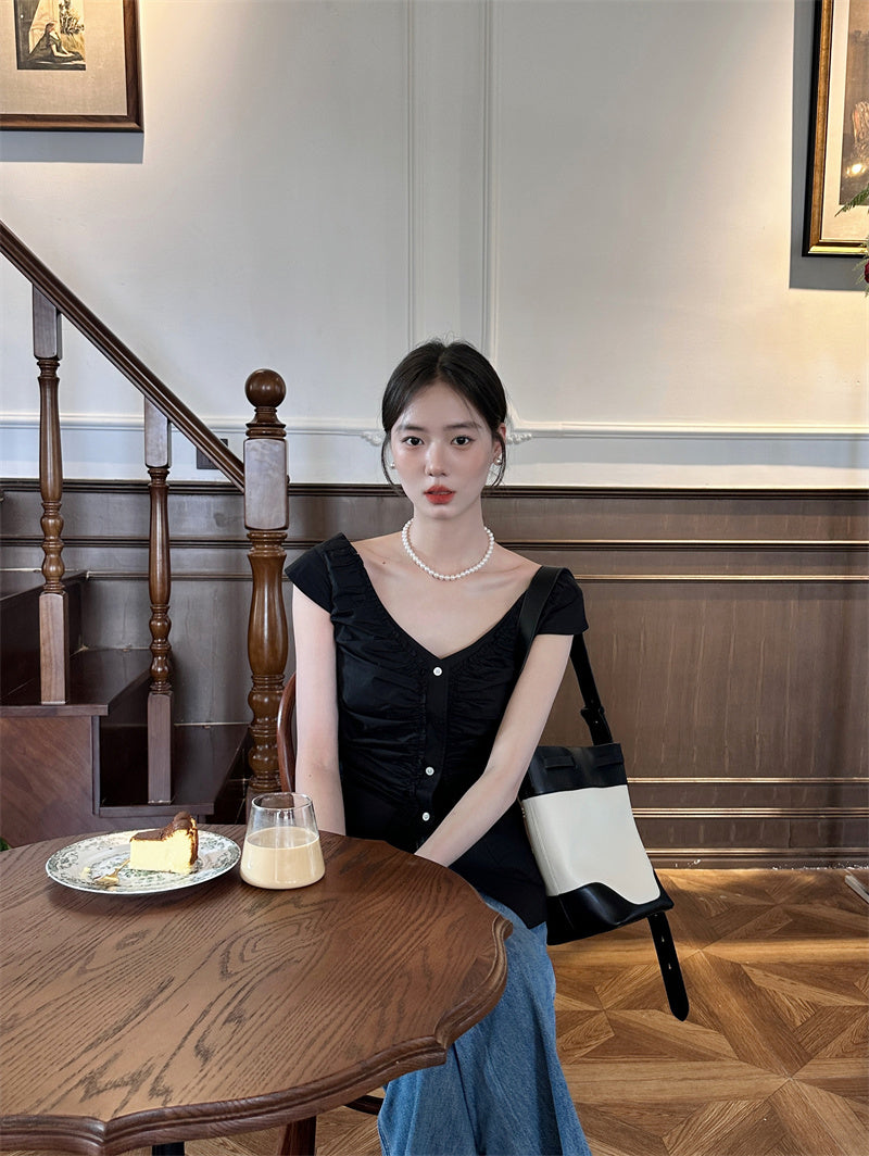 Thu. 法式抓皺大領上衣 黑