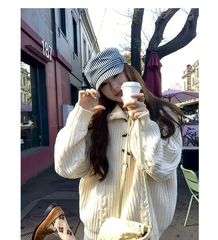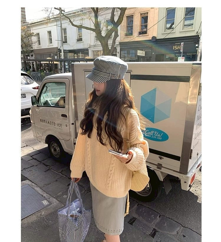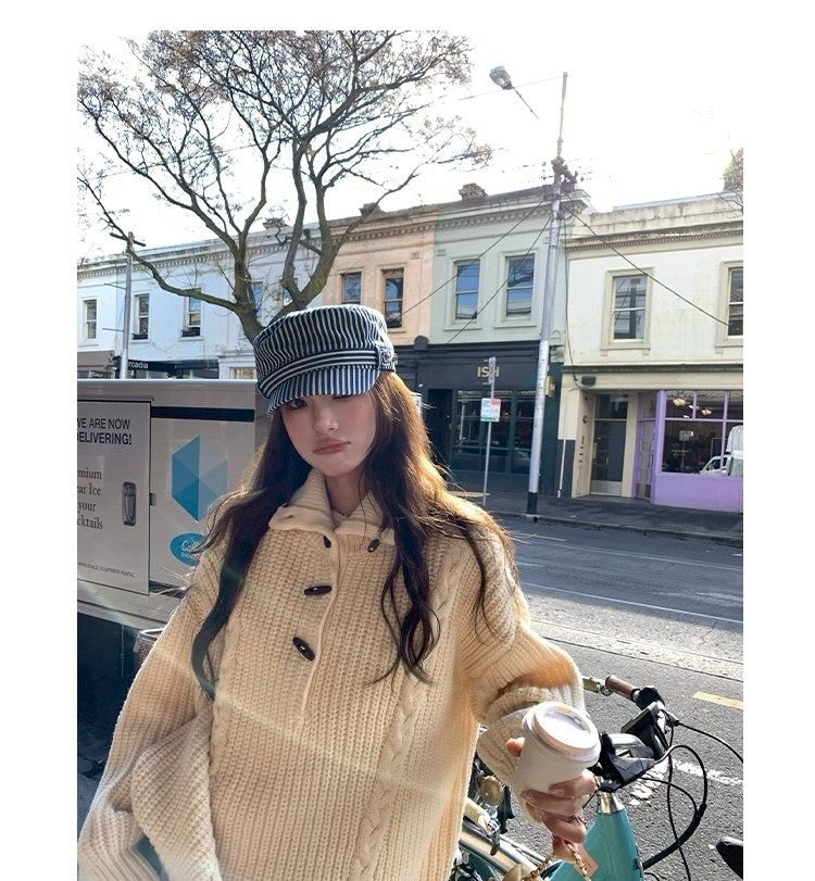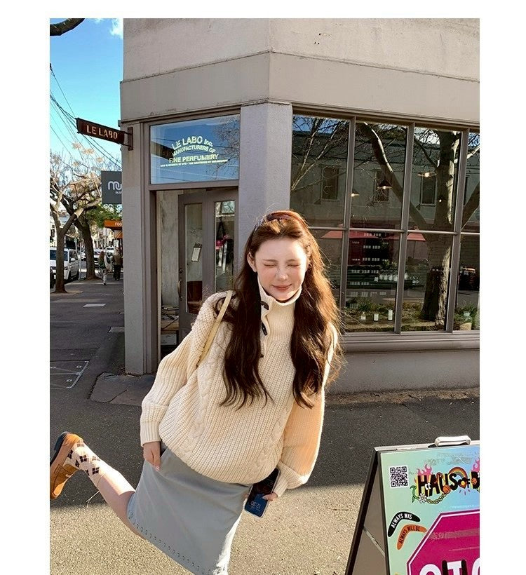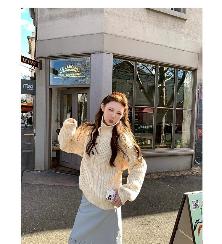 Thu. 濟州橙酒 厚麻花鈕扣高領針織上衣 杏