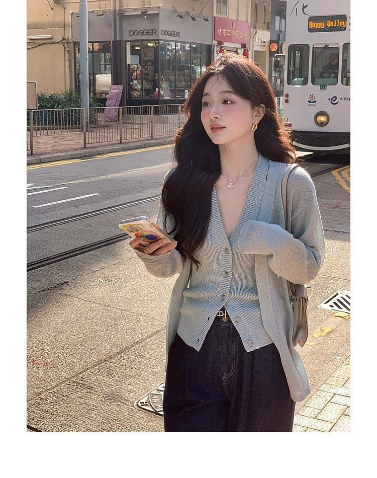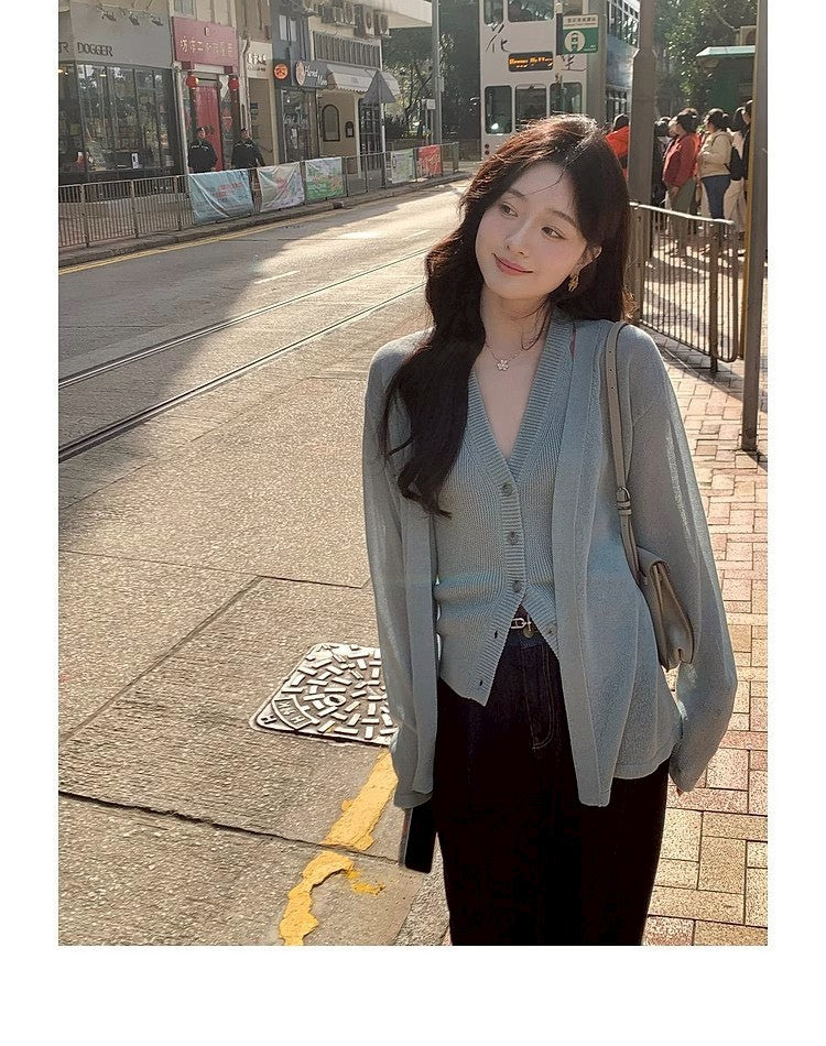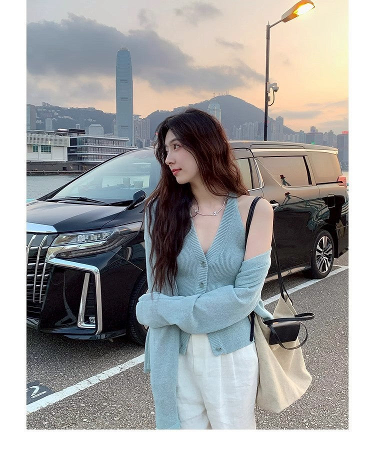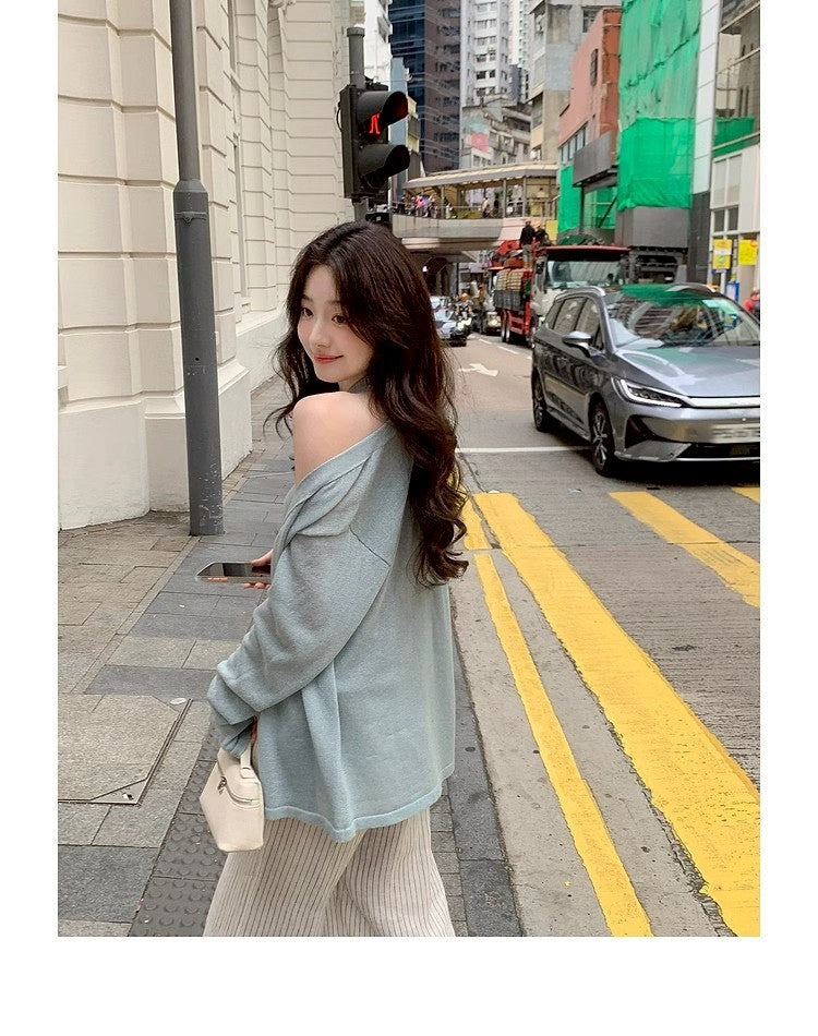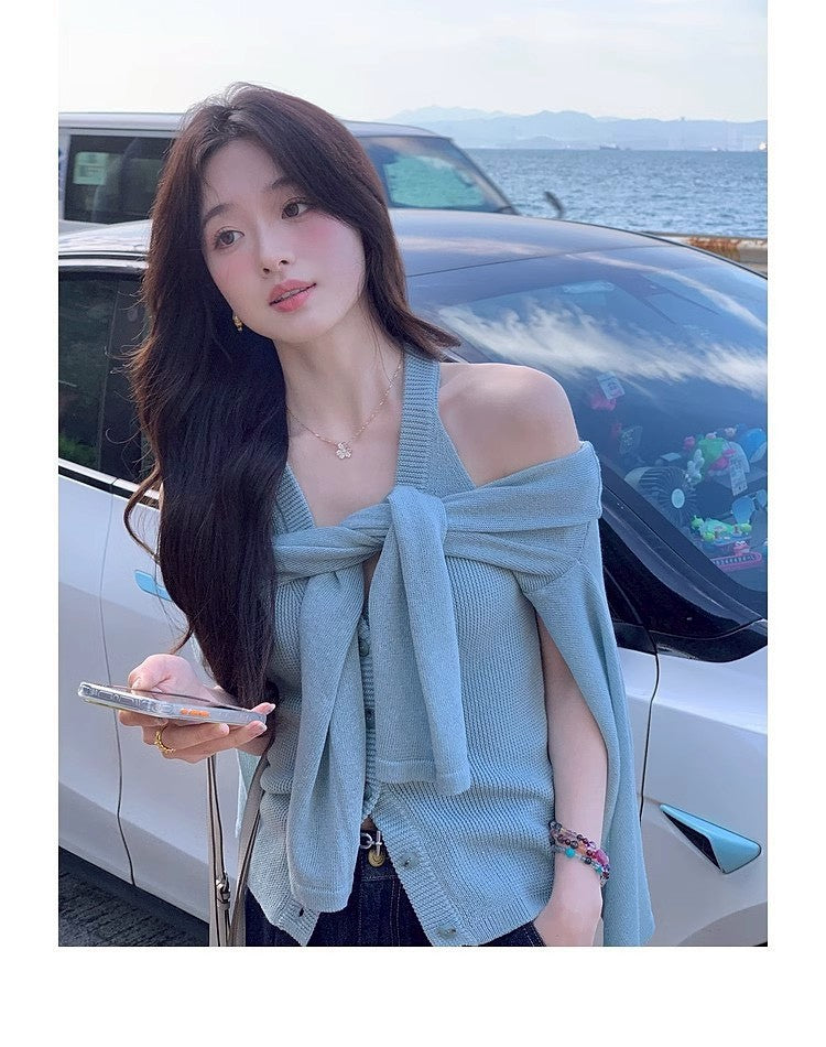 Thu. 自由領落仿天絲亞麻針織上衣2件套 鹽藍