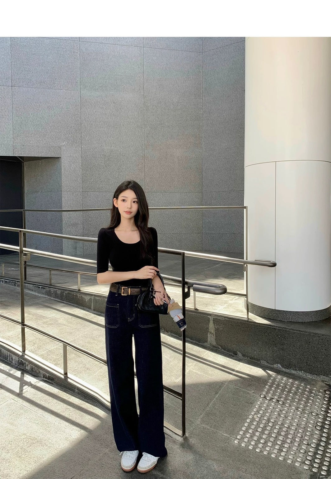 Thu. 超好搭韓女氣質五分袖U領上衣 黑