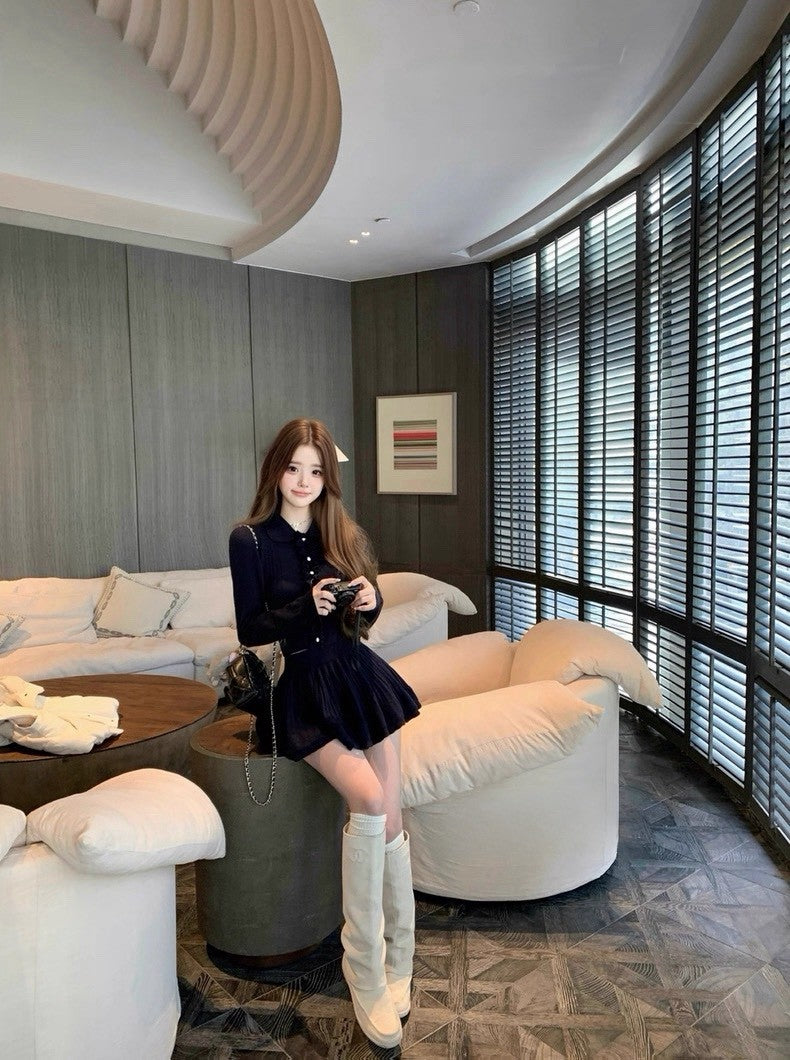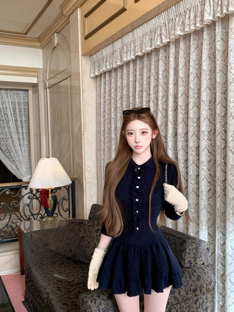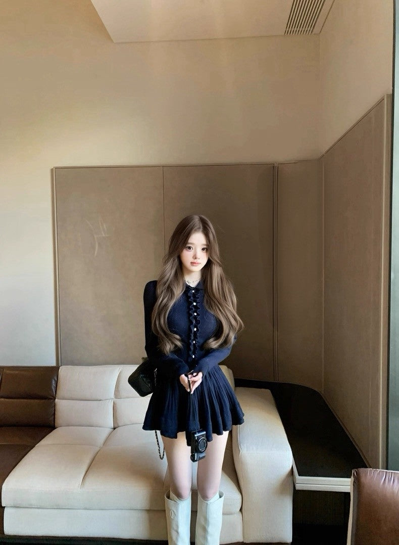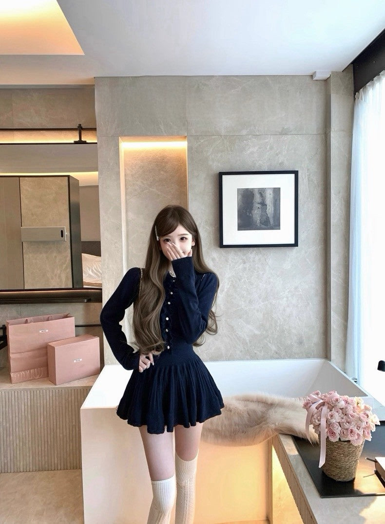 Tue. 優等生公式 藏藍木耳邊針織半身裙套裝