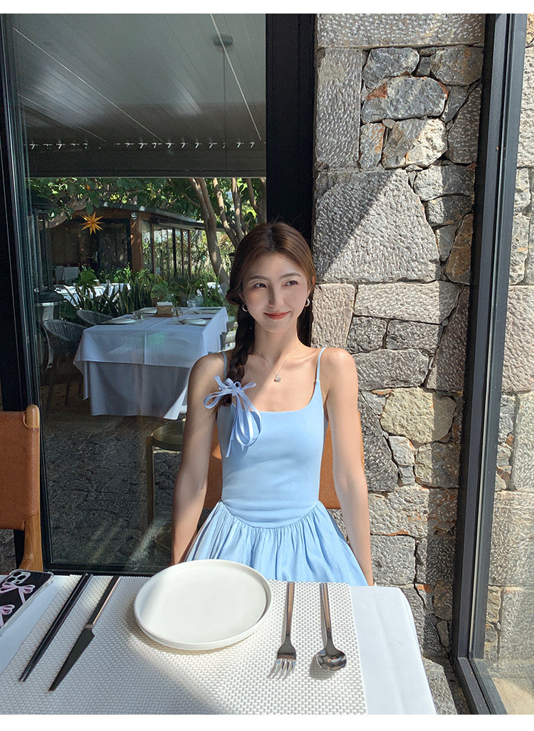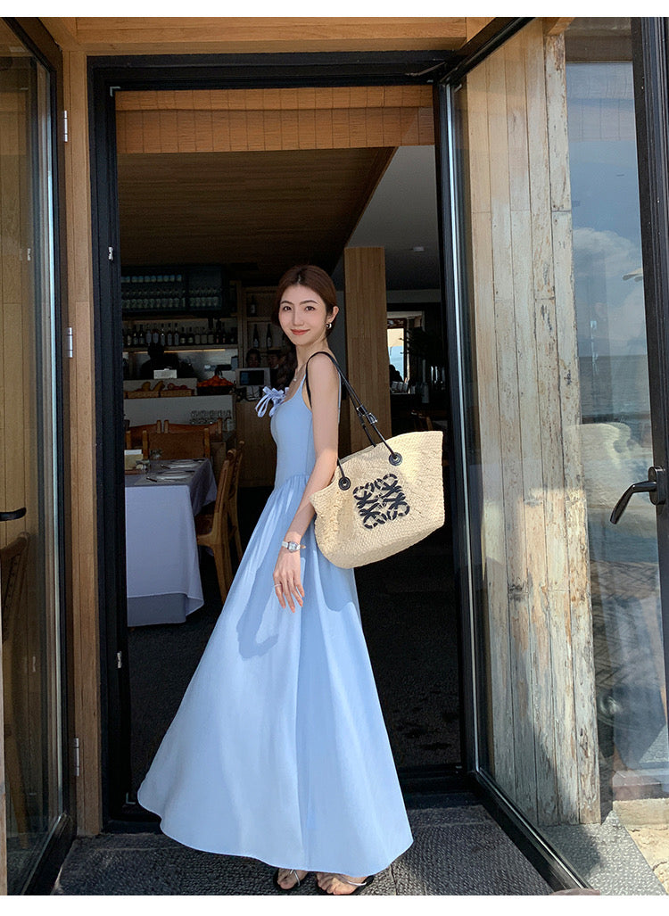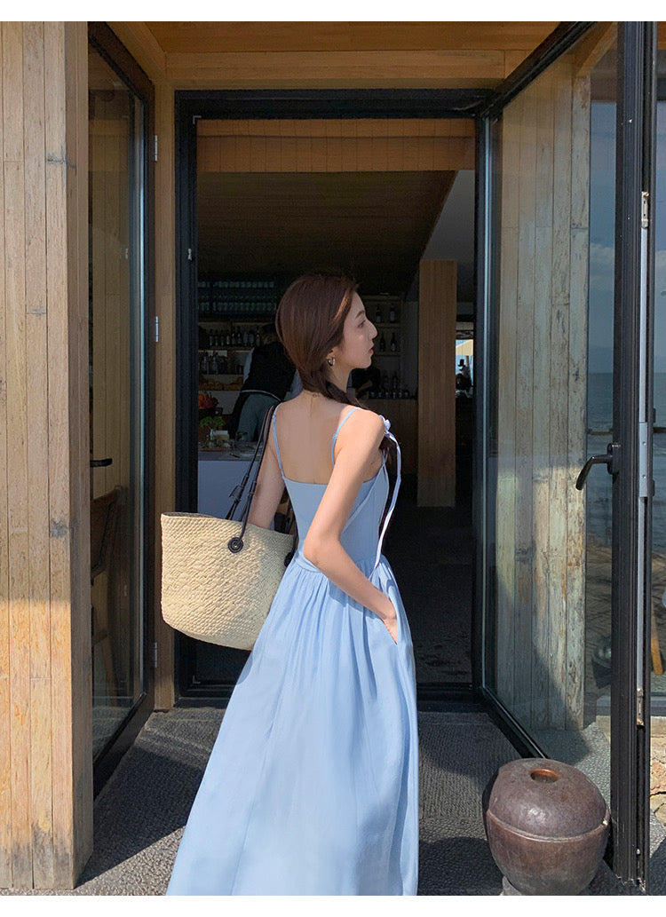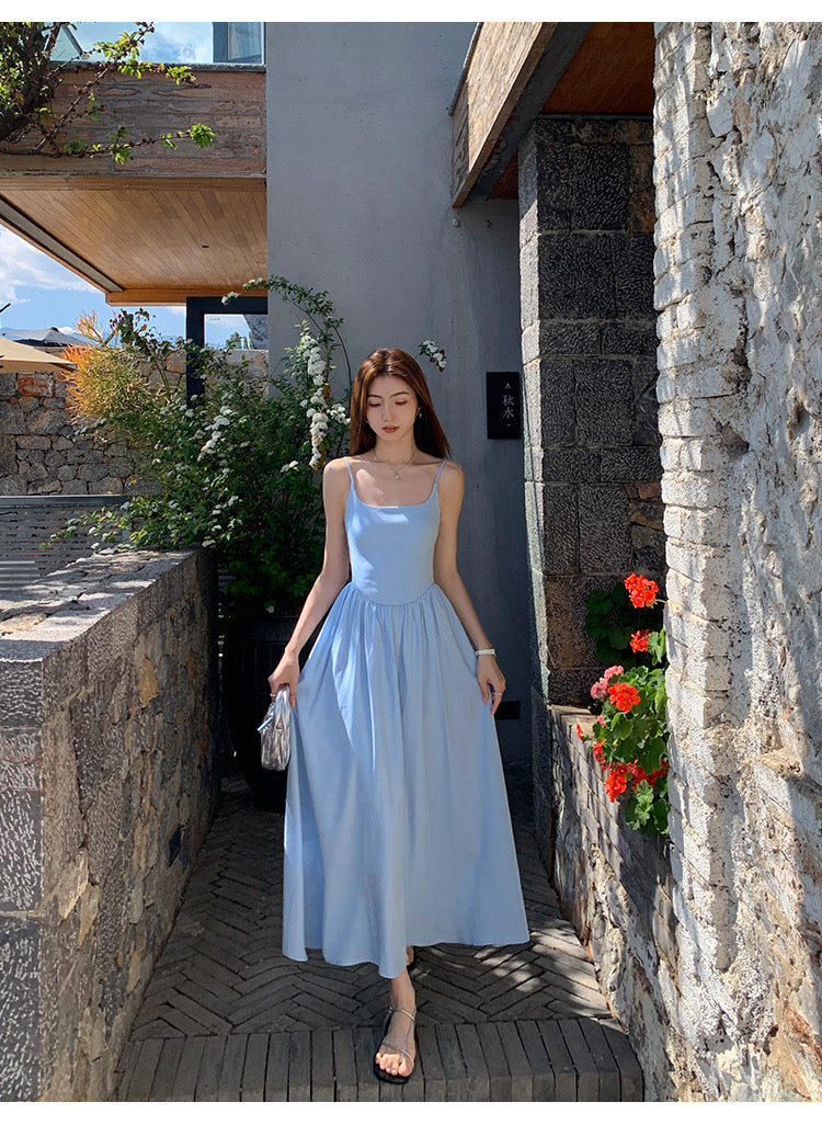 Tue. 夏日百搭U領赫本風自帶胸墊顯瘦連身裙 藍