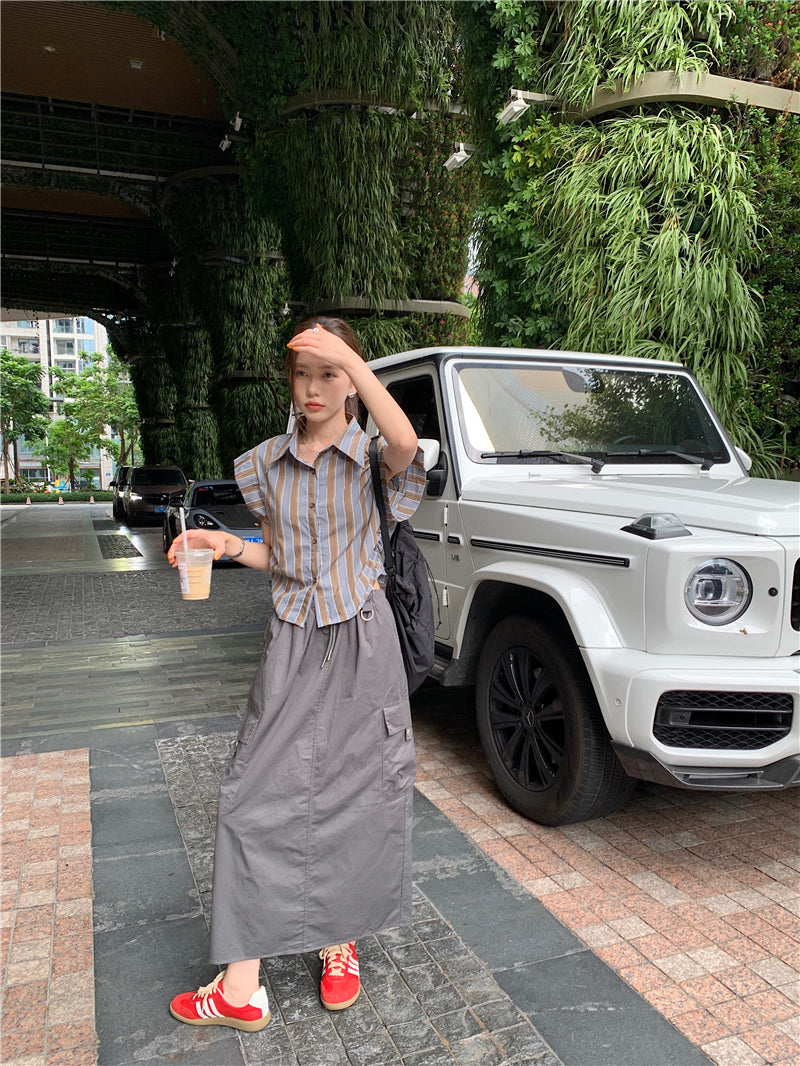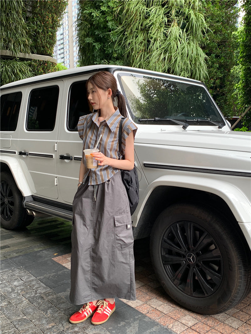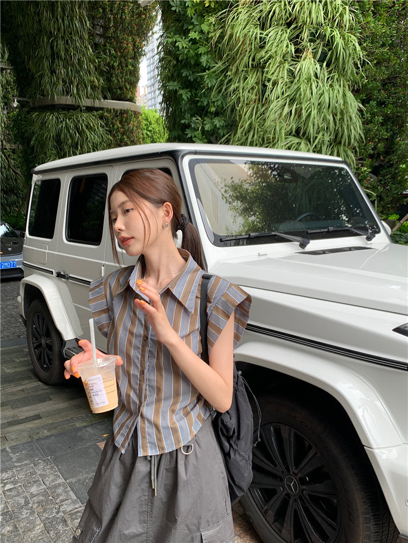 Tue. 復古條紋抓皺襯衫 咖