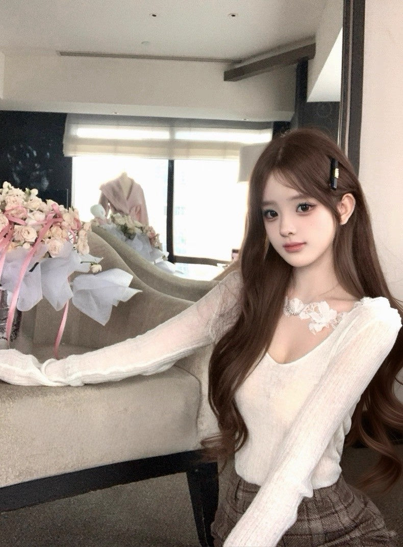 Tue. 心動蕾戀貓語 坑條羊毛 V領打底上衣 白