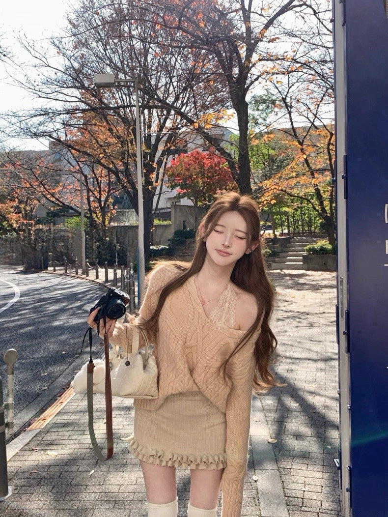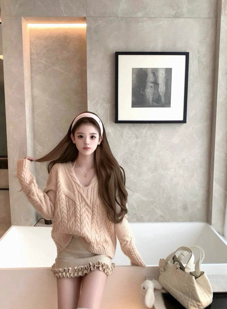 Tue. 歐尼香氣氣質V領百搭粉杏麻花上衣 燕麥色花邊高腰包臀裙