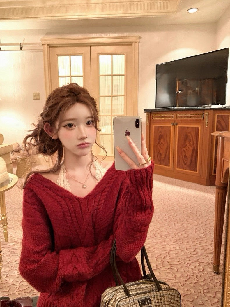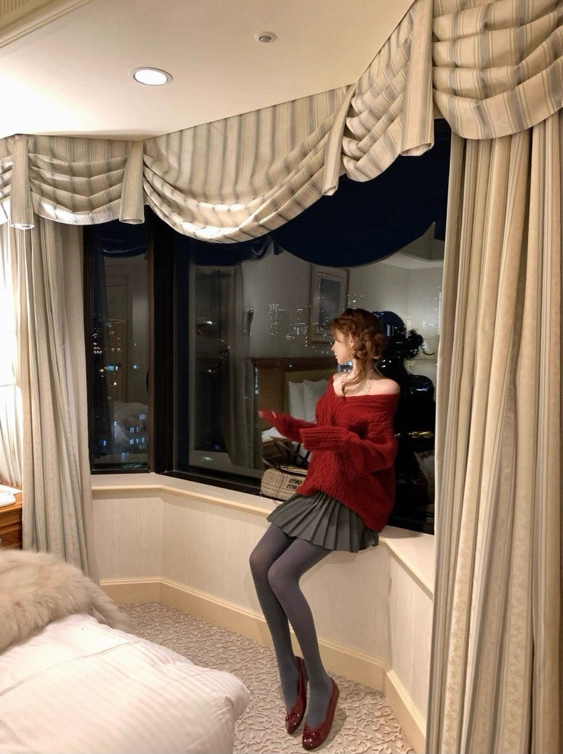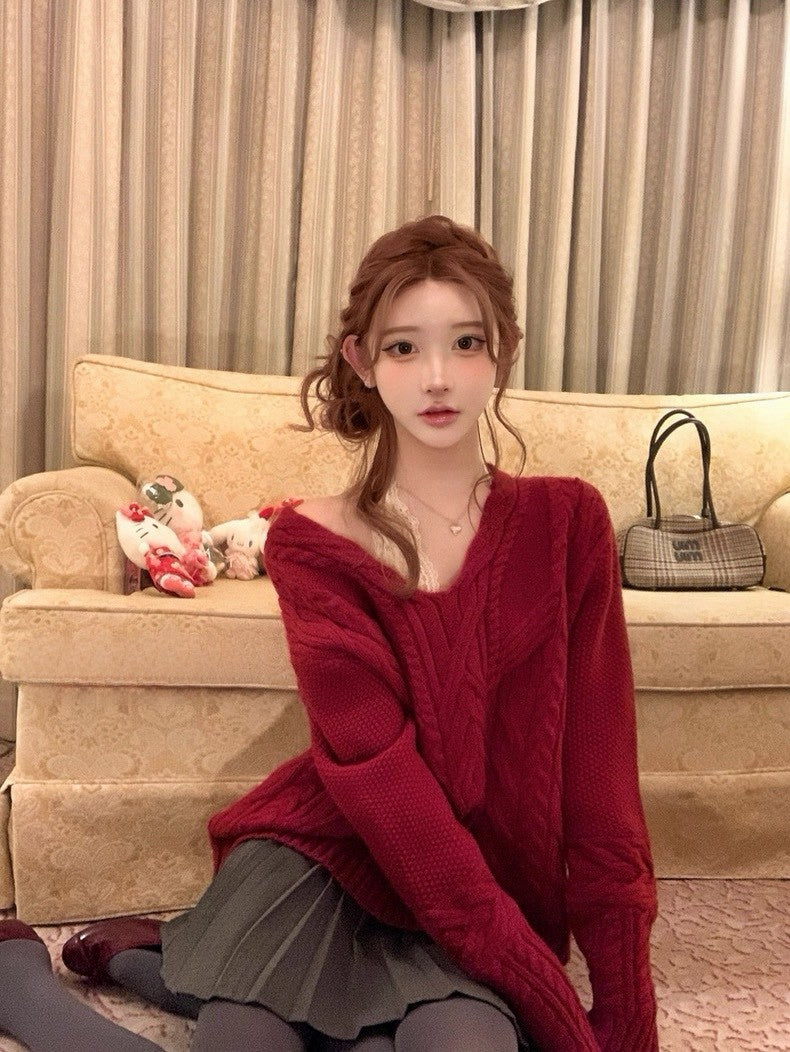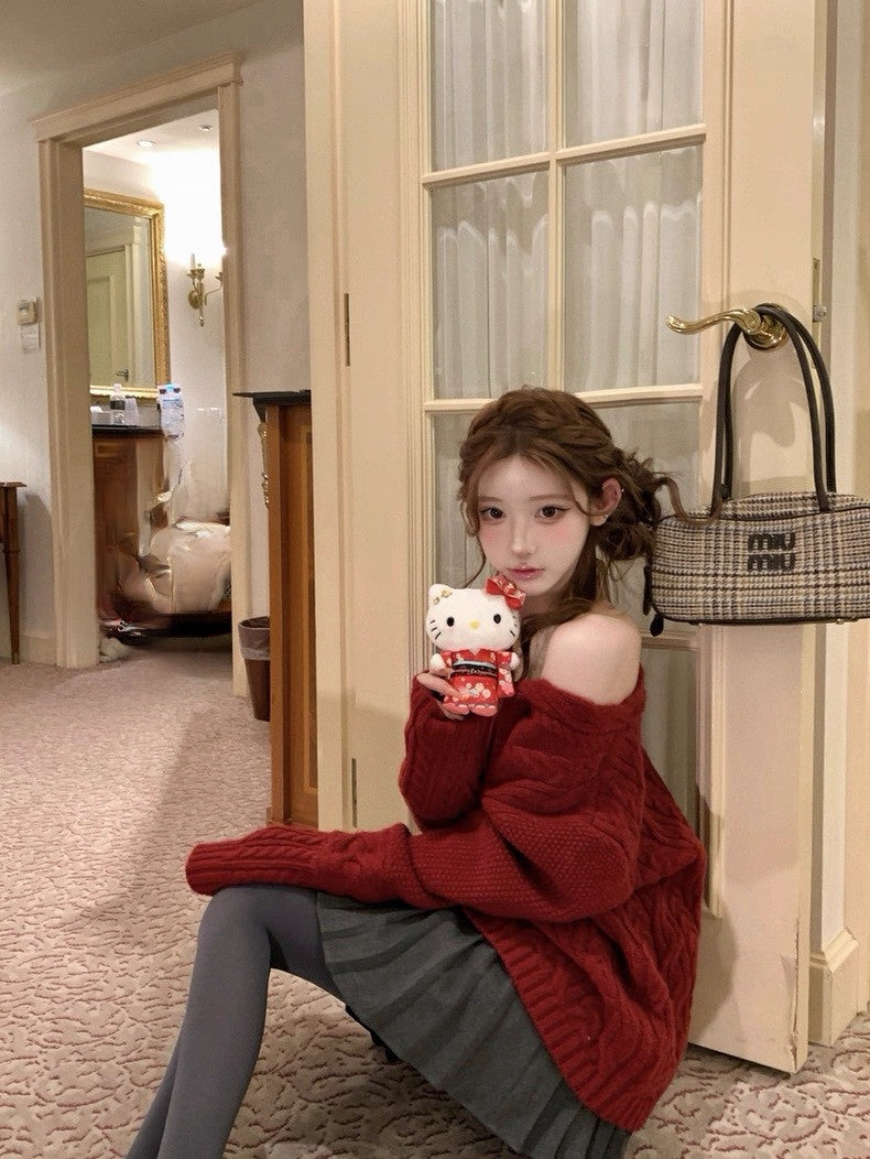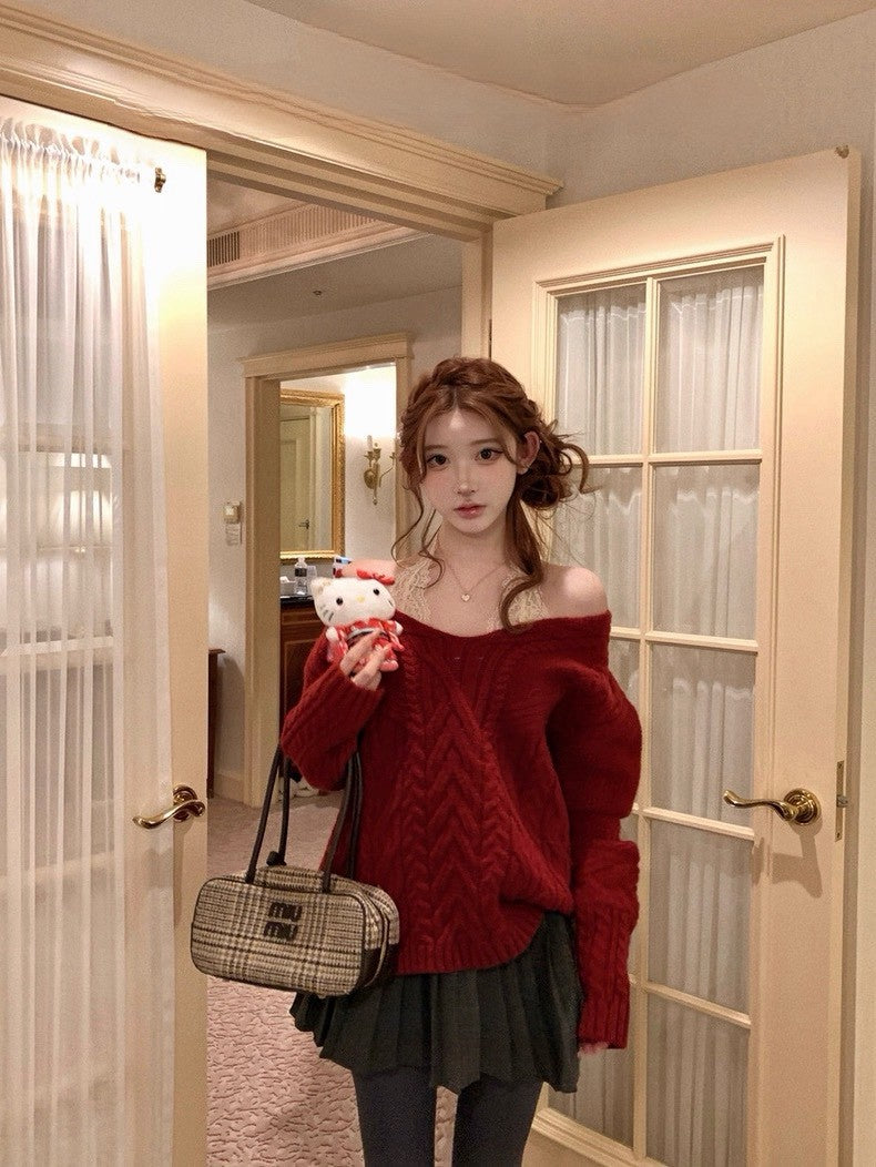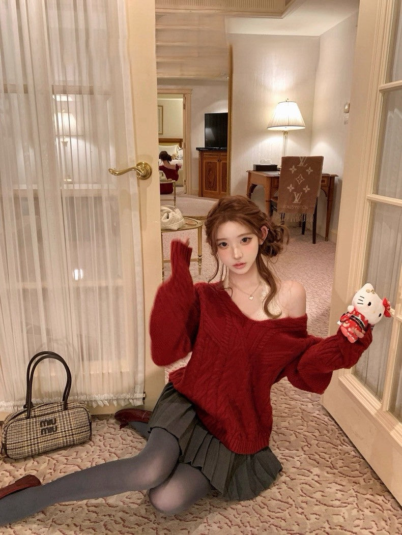 Tue. 歐尼香氣氣質V領百搭紅色麻花上衣 灰色百褶裙