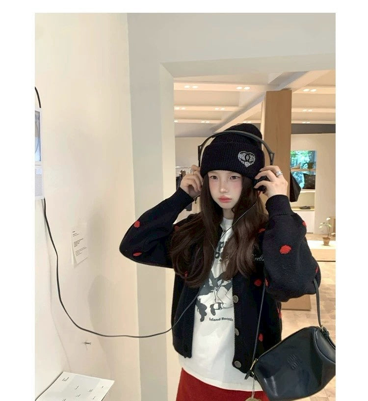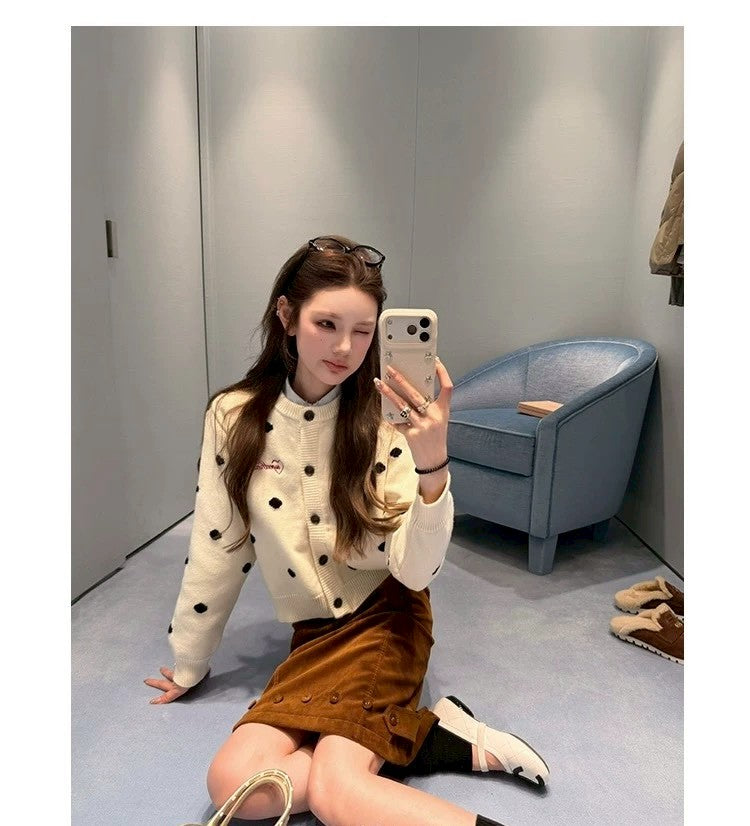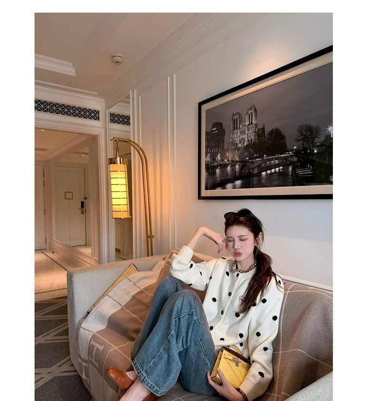 Tue. 雪夜遊樂園韓系波點撞色針織外套 白/黑