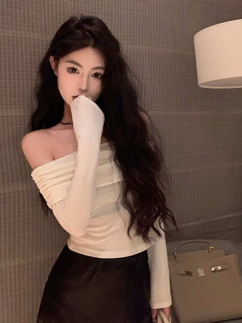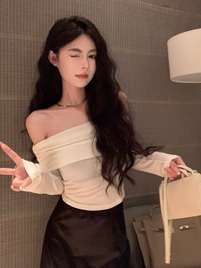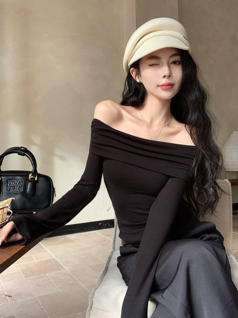 Wed. 基礎彈力百搭一字領上衣 黑/米白