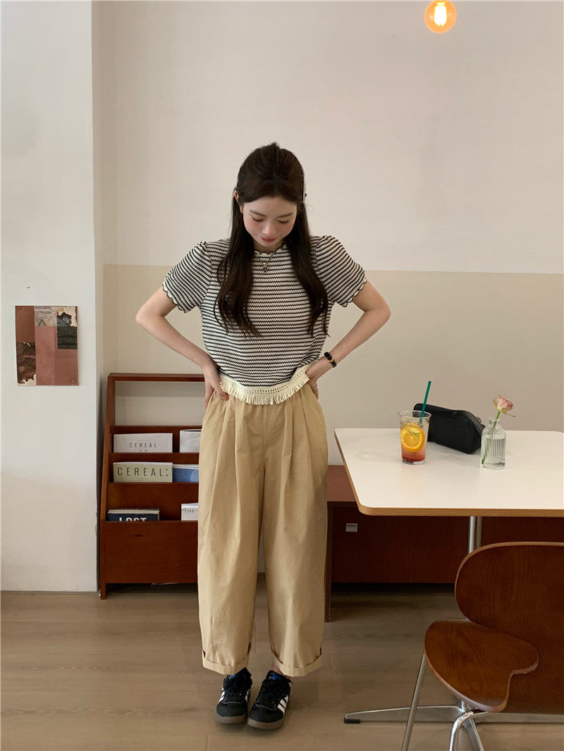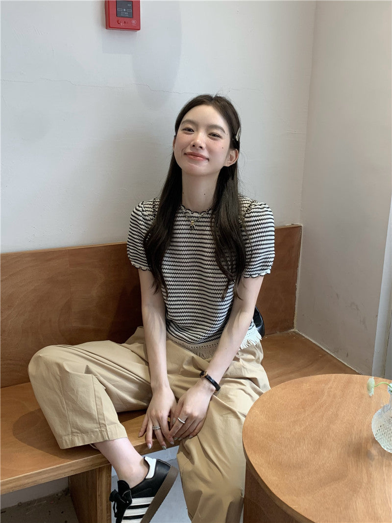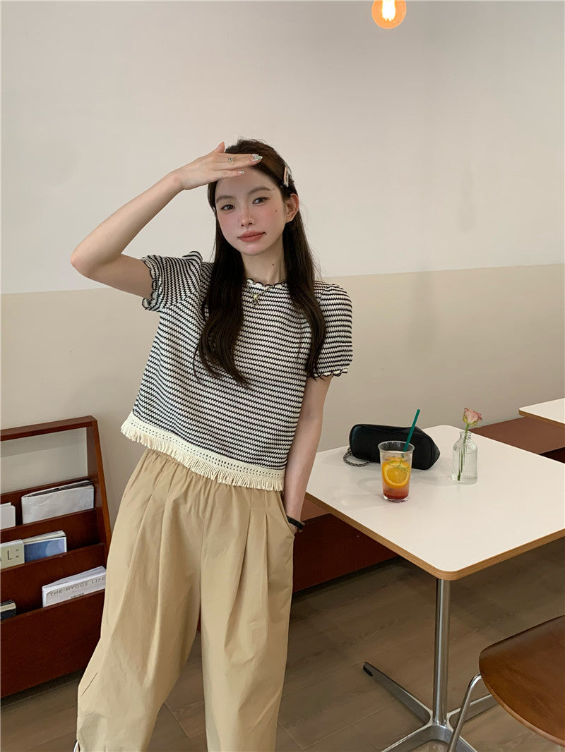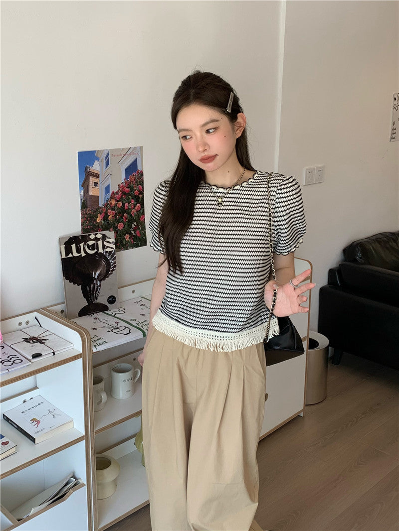 Wed. 編織流蘇繞邊條紋上衣